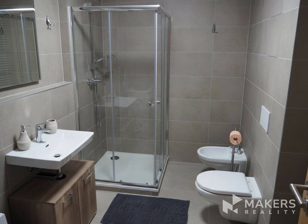 Koupelna je vybavená moderním sprchovým koutem, umyvadlem s úložným prostorem, toaletou a bidetem. Dominují zde neutrální tóny v kombinaci světlých obkladů, které zajišťují dojem prostornosti a čistoty. Součástí koupelny je také pračka, což je velká výhoda pro pohodlné bydlení.