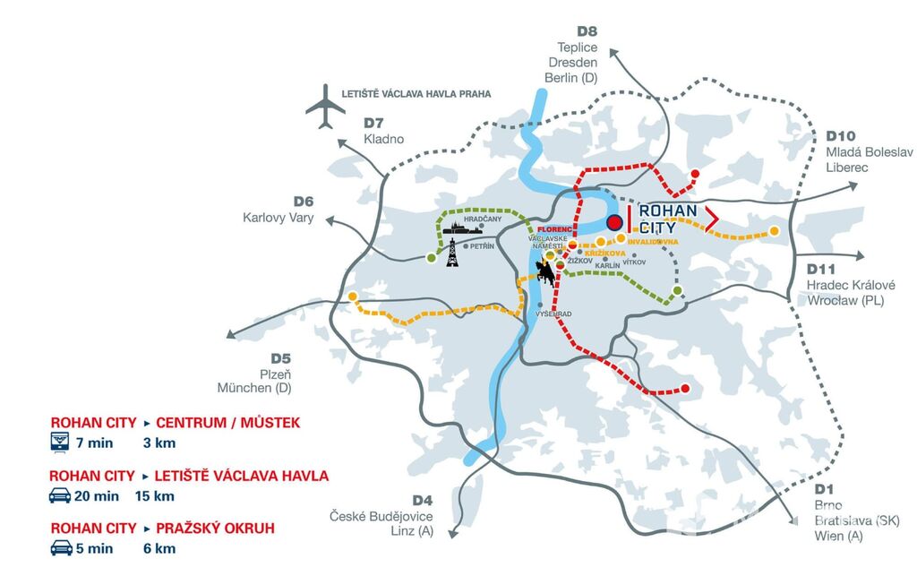 Tato prestižní lokalita v srdci Karlína patří mezi nejžádanější části Prahy. Nabízí dokonalé propojení městského stylu života s klidem a zelení v okolí řeky Vltavy. Pouze 5 minut chůze od domu se nachází stanice metra Invalidovna (linka B), tramvajová i autobusová zastávka, takže do centra města se dostanete během 7 minut.