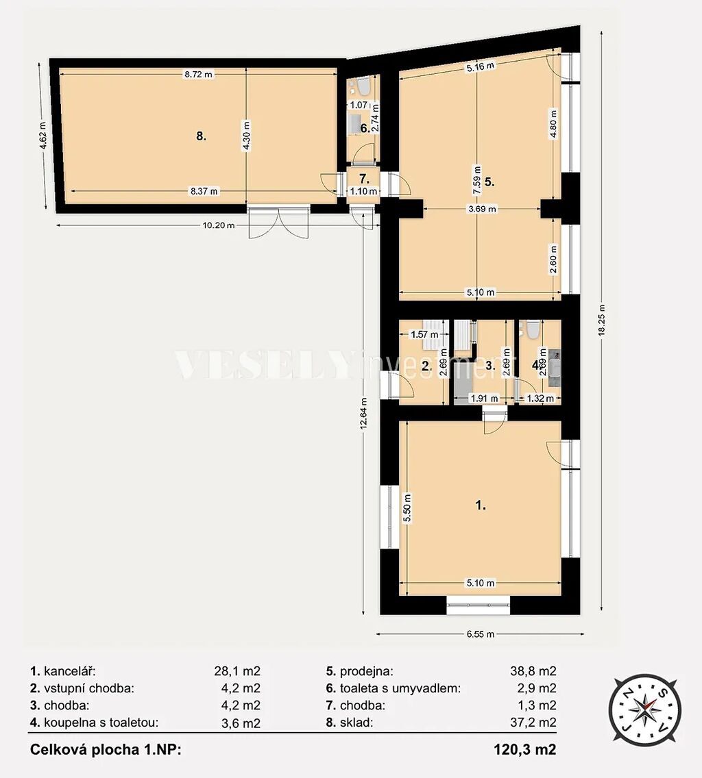 V 1.NP je možné vybudovat 2 komerční prostory. Viz. půdorys, první jako kancelářský prostor, druhý jako obchodní plocha se skladem a s výlohami do ulice.