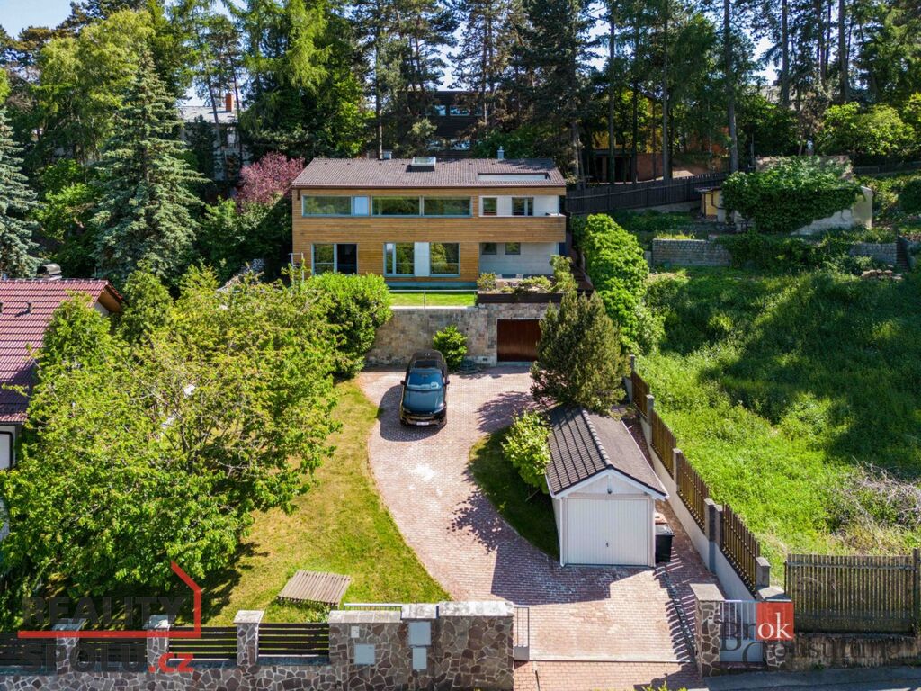 Dům má podlahovou plochu téměř 200m2 a k tomu 2 garáže. Stojí na svažitém, upraveném pozemku (723 m²) se vzrostlými stromy a na konci slepé ulice Za Mototechnou. Díky tomu, že dům stojí v horní části pozemku (nad garáží), máte úžasné výhledy jak z přízemí, kde je velká terasa a část zahrady, tak samozřejmě i v prvním patře domu.