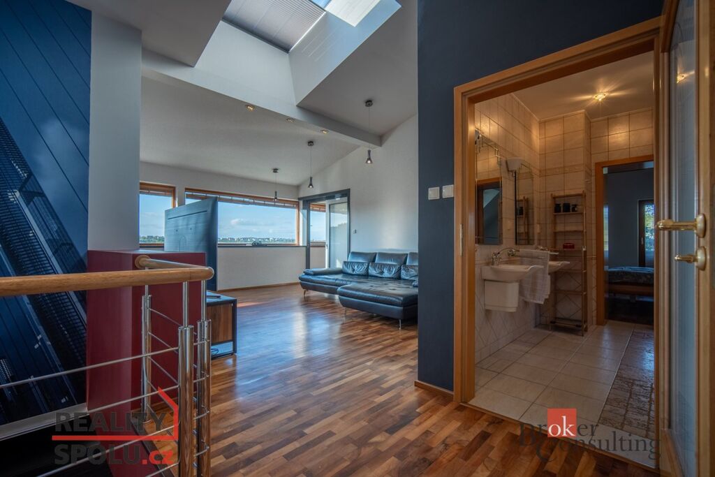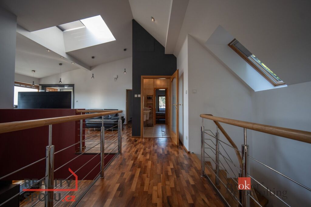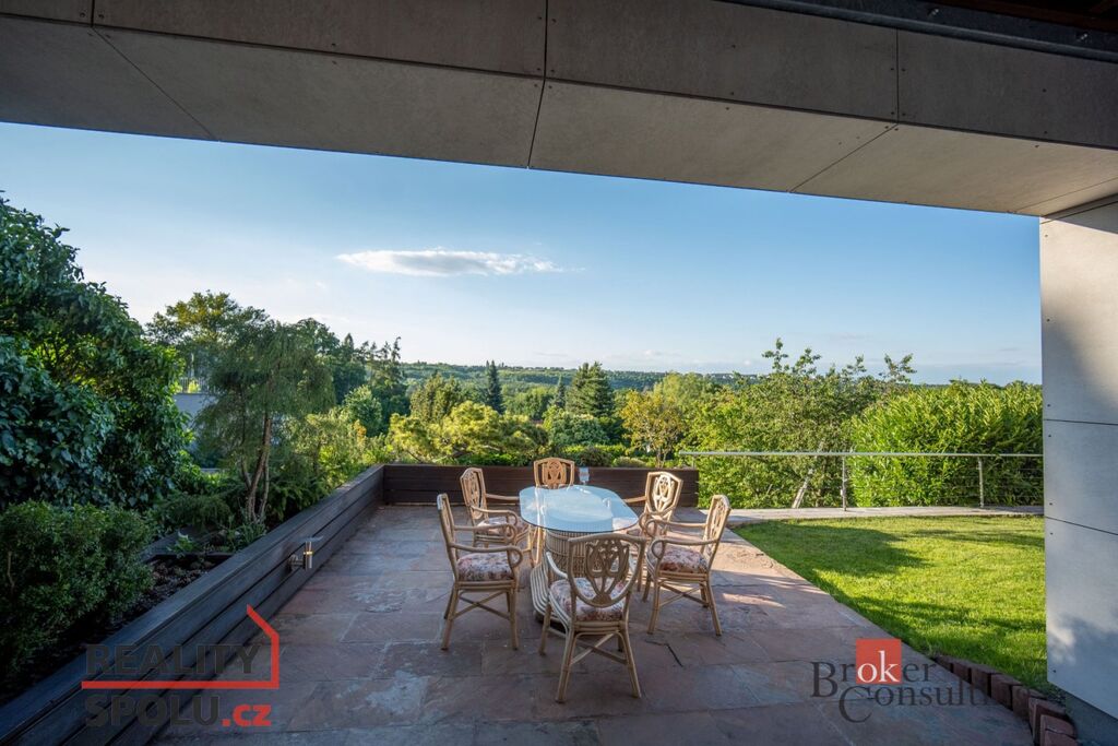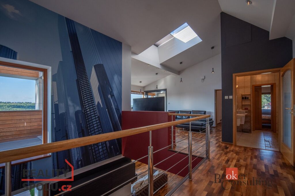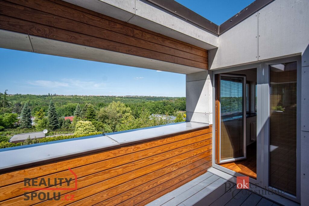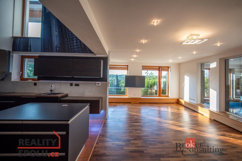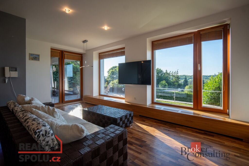 V přízemí domu se nachází velký obývací pokoj s kuchyní, koupelnou a vstupem do další části domu kde je vnitřní bazén a infrasauna. Tato část domu má 100 m2. Ve druhém patře je atrium, vstup do třech pokojů, na terasu a do koupelny. Hlavní ložnice má samostatný vstup do koupelny. Podlahy jsou dřevěné a v pokojích vestavěné skříně. Úžasné je prosklení, které je po celé délce severozápadní stěny s výhledem na část Prahy 5 a dále – Motol, Ladronku až po Břevnov.