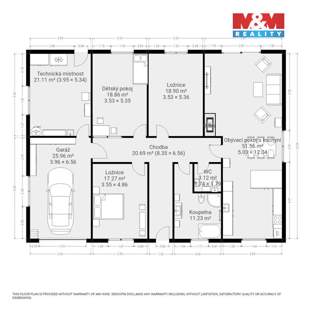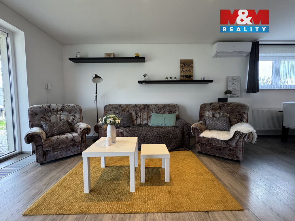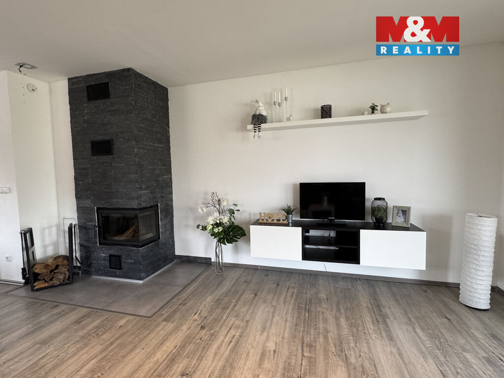 Srdcem domu je velkorysý obývací pokoj s kuchyňským koutem, krbem, klimatizací a přímým vstupem na terasu. Dispozice domu dále zahrnuje tři samostatné pokoje, koupelnu, WC, technickou místnost a garáž.
