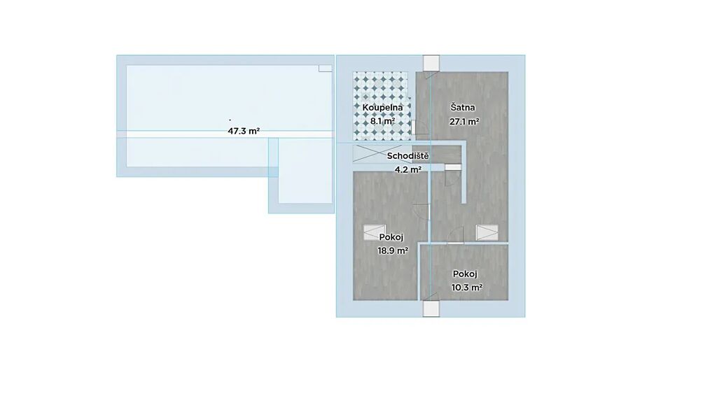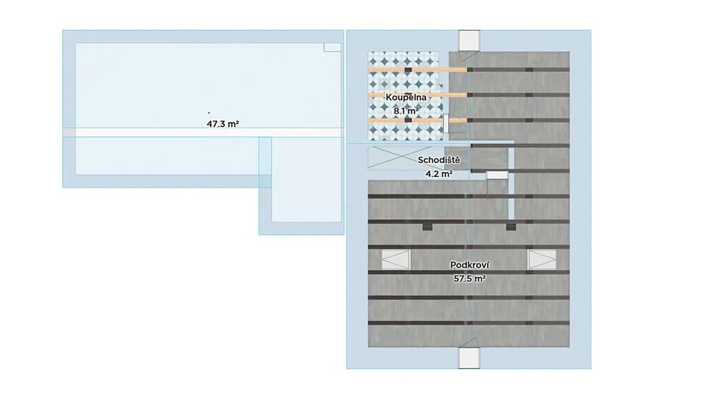 Dům má užitnou plochu 180 m2 a prozatím dispozici 4+kk - ve spodním patře je kuchyně propojená s obývacím pokojem, koupelna a dvě ložnice. V patře je pak aktuálně na místnosti nedělené podkroví. V galerii se můžete podívat na dvě možné varianty řešení. První návrh představuje podkroví jako jeden velký obytný prostor s ložnicí a obývací částí, kdy chodba slouží zároveň jako šatna a prostor před koupelnou jako pracovní koutek. Druhý návrh přidává další 2 místnosti coby dětské pokoje či ložnice s místem pro úložné prostory.