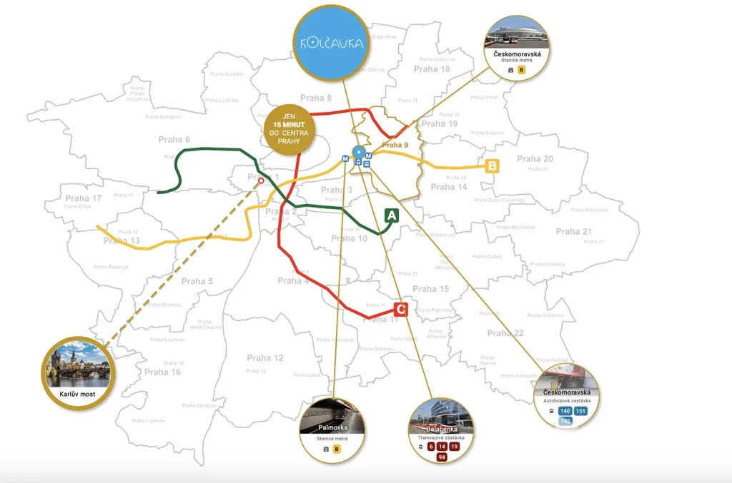 Rezidenční projekt KOLČAVKA je situován v atraktivní části Prahy s kompletní občanskou vybaveností. V docházkové vzdálenosti najdete množství stylových restaurací a kaváren, obchodní centrum Harfa, supermarkety, menší obchody, lékárny a polikliniku Vysočanská. Přímo v ulici se nachází soukromý pivovar Kolčavka, v blízkosti pak O2 arena, divadlo Pod Palmovkou a divadlo Gong.