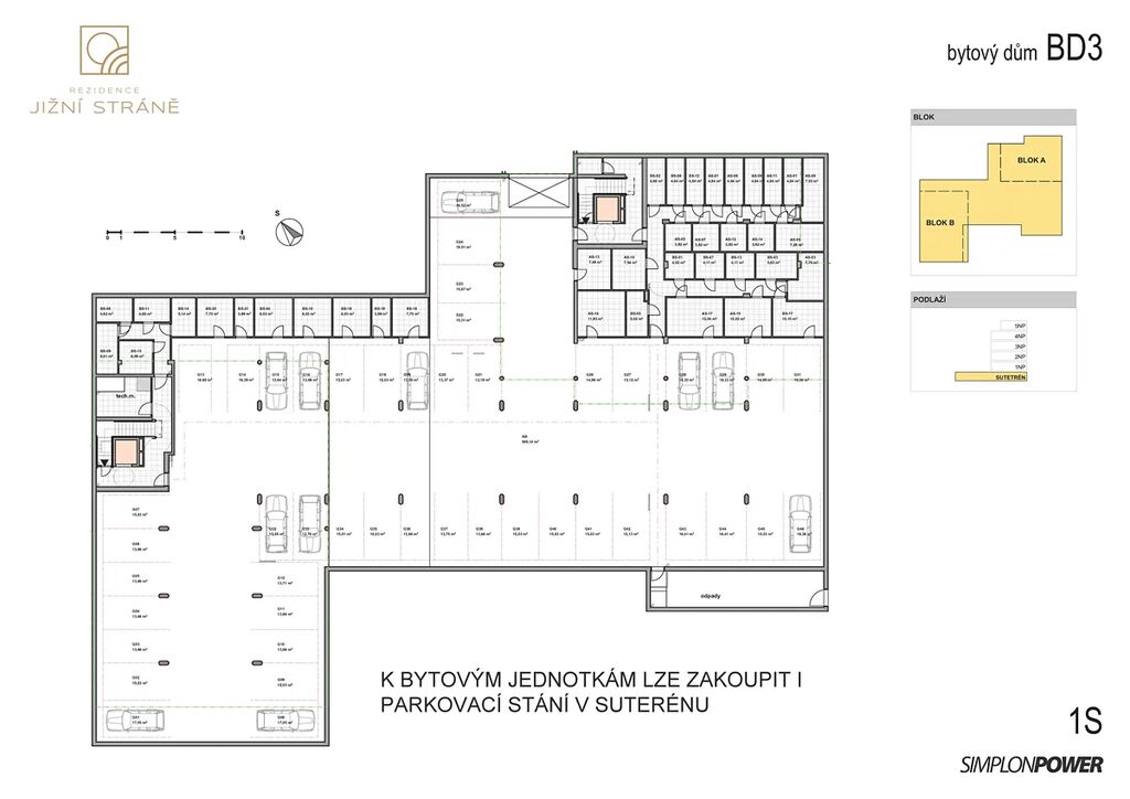 K bytu je možné dokoupit parkovací stání v suterénu domu.
