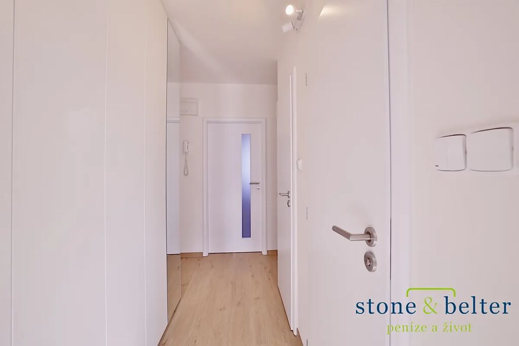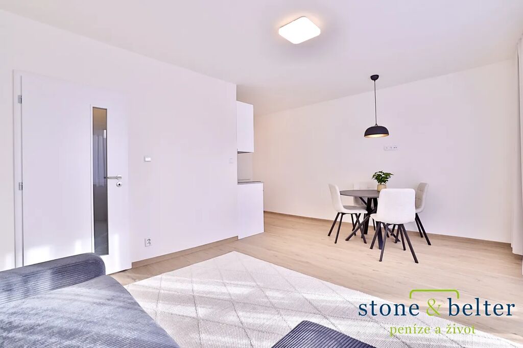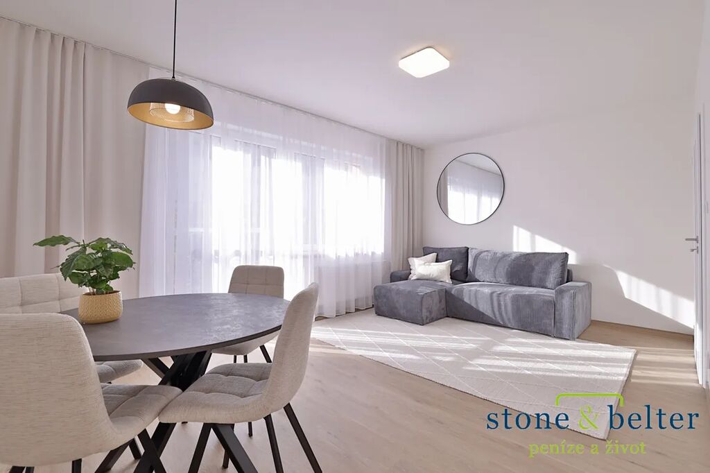 Podlahy tvoří kvalitní vinyl, byt je vybaven moderním nábytkem a připraven k okamžitému nastěhování.