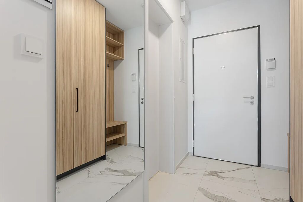Byt je plně vybavený, dokončený 10/2022. Obývací pokoj/ložnice má velké francouzské okno, automatické předokenní žaluzie, terasu a zahrádku. Byt je zařízený na míru. V kuchyni jsou vestavěné spotřebiče - lednice, myčka, horkovzdušná trouba a indukční varná deska. Obývací pokoj je prakticky zařízen sklopnou pohodlnou postelí, sedačkou, stolky, skříněmi s úložným prostorem.