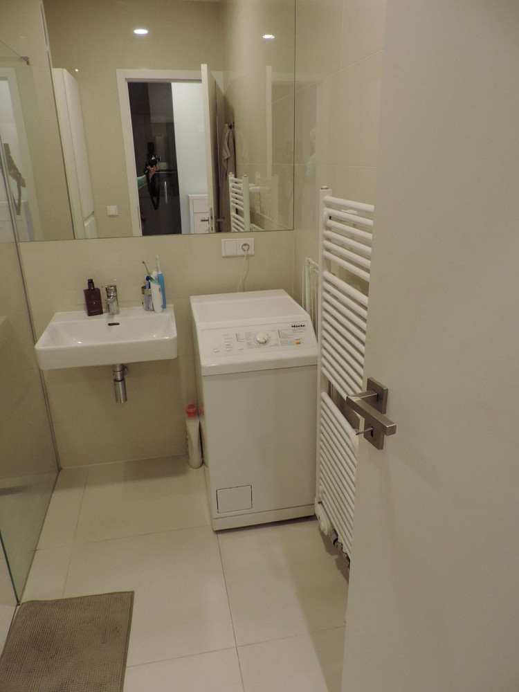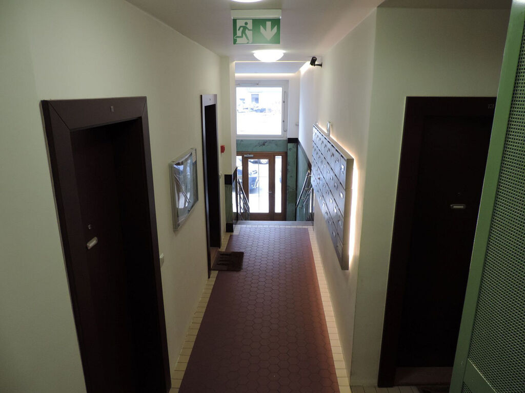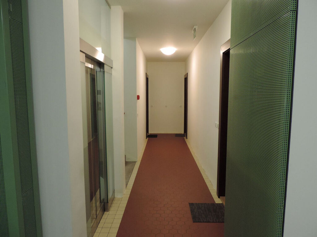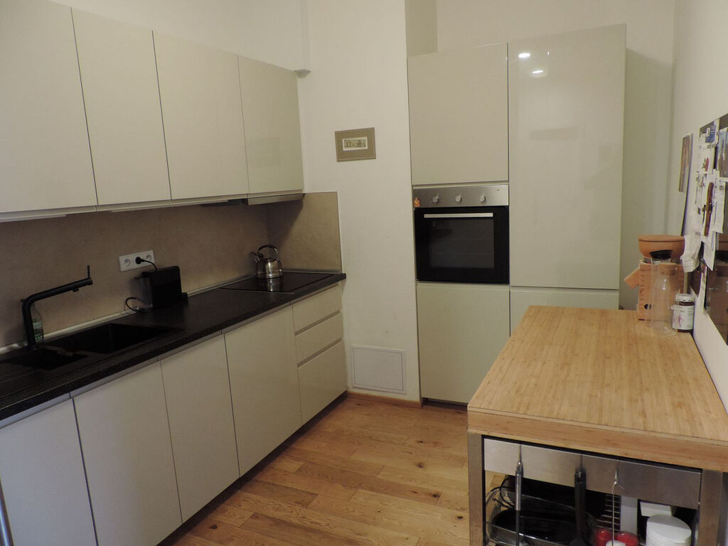 Byt není zařízen nábytkem, kuchyňská linka je vybavena elektrickou varnou deskou a troubou, digestoří, lednicí s mrazákem a myčkou. Na podlahách v obytných místnostech jsou parkety, na chodbě, v koupelně a na WC je dlažba.