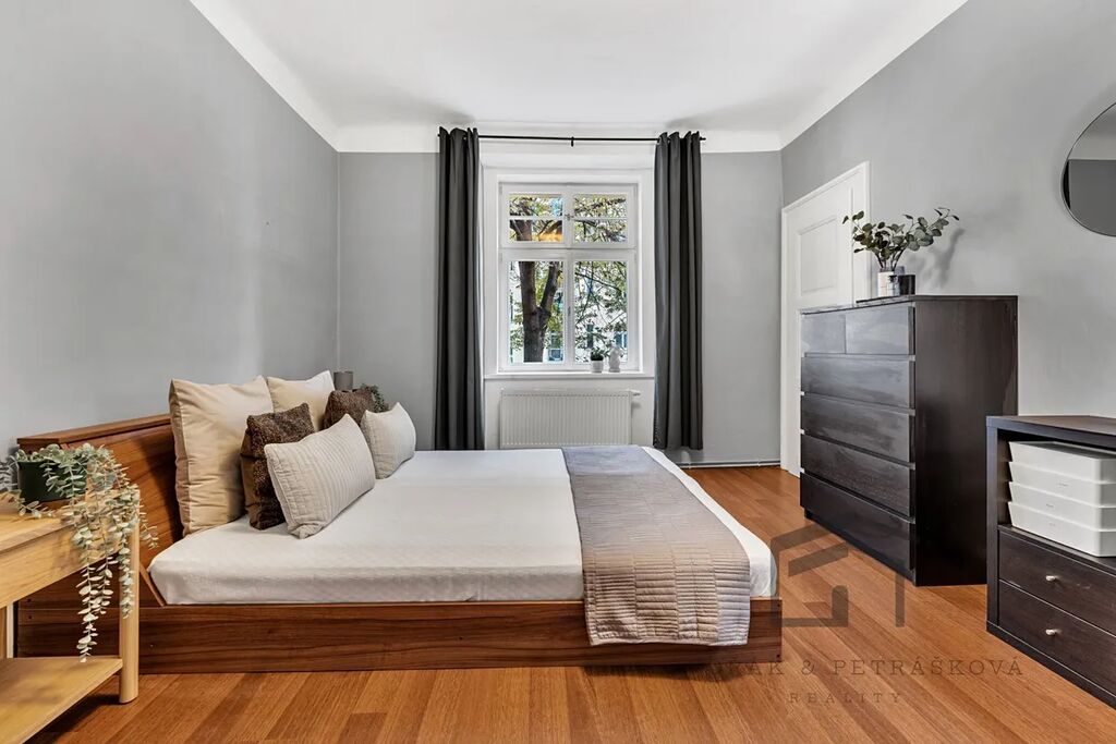 Byt s podlahovou plochou 62 m2 se nachází v prvním nadzemním podlaží a disponuje předsíní, na kterou navazuje kuchyňský kout s oknem do klidného dvora, samostatnými vstupy do obou pokojů (obývacího pokoje a ložnice), do koupelny a na toaletu. Obývací pokoj (25 m2) s dřevěnou podlahou a vysokými stropy je orientovaný do ulice, ložnice (19 m2) je umístěna separátně s okny do dvora a se vstupem do komory - ta vám může posloužit jako menší šatna. Kuchyňský kout (8,6 m2) je vybavený myčkou na nádobí, lednicí s mrazákem, elektrickou horkovzdušnou troubou, mikrovlnou troubou, plynovým sporákem a dostatkem úložného prostoru. Koupelna s vanou a pračkou je umístěna od toalety separátně. Okna jsou špaletová s dvojitým rámem (vnějším a vnitřním). Vytápění bytu a ohřev vody zajišťuje plynový kotel se zásobníkem na vodu. Byt je dle prohlášení vlastníka klasifikován jako 2+kk, současná dispozice je však 2+1.