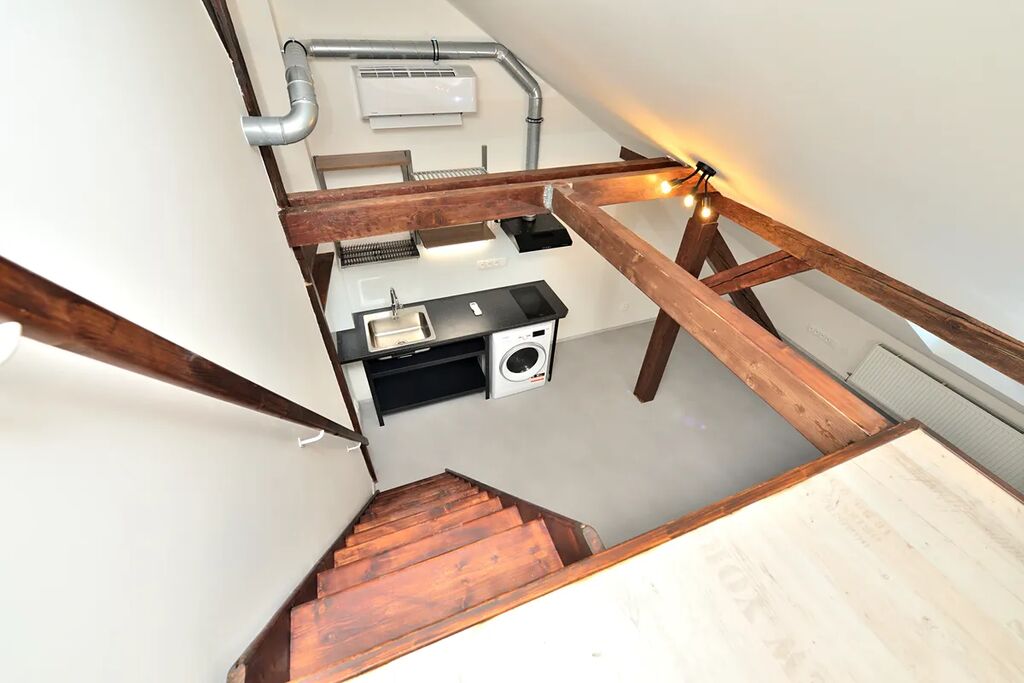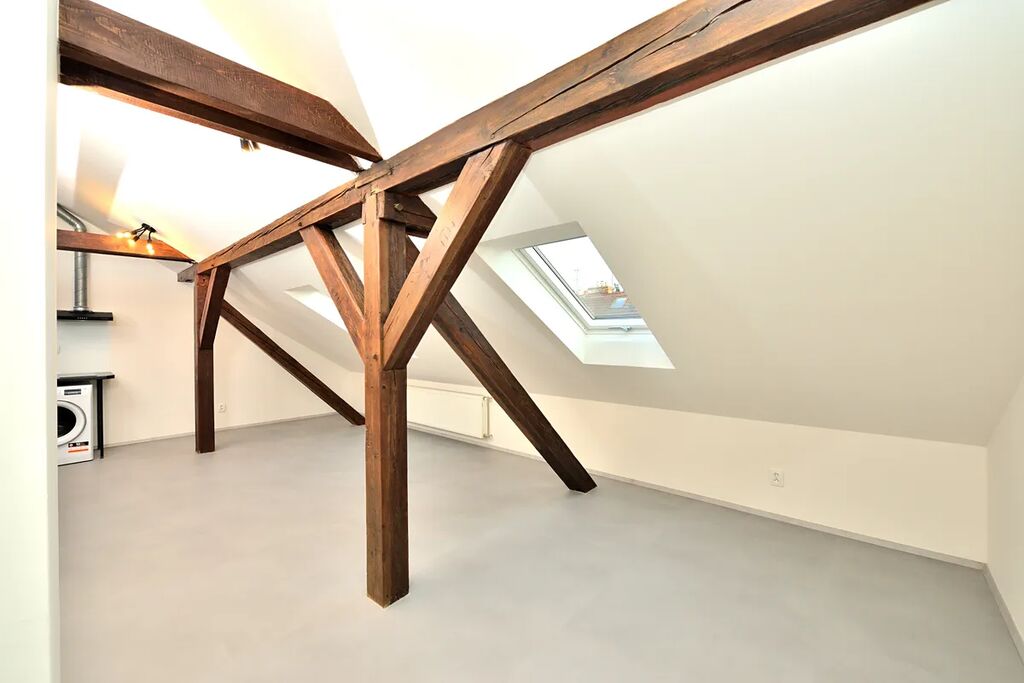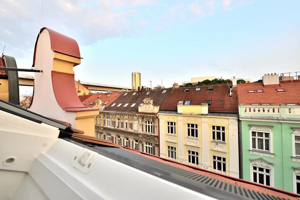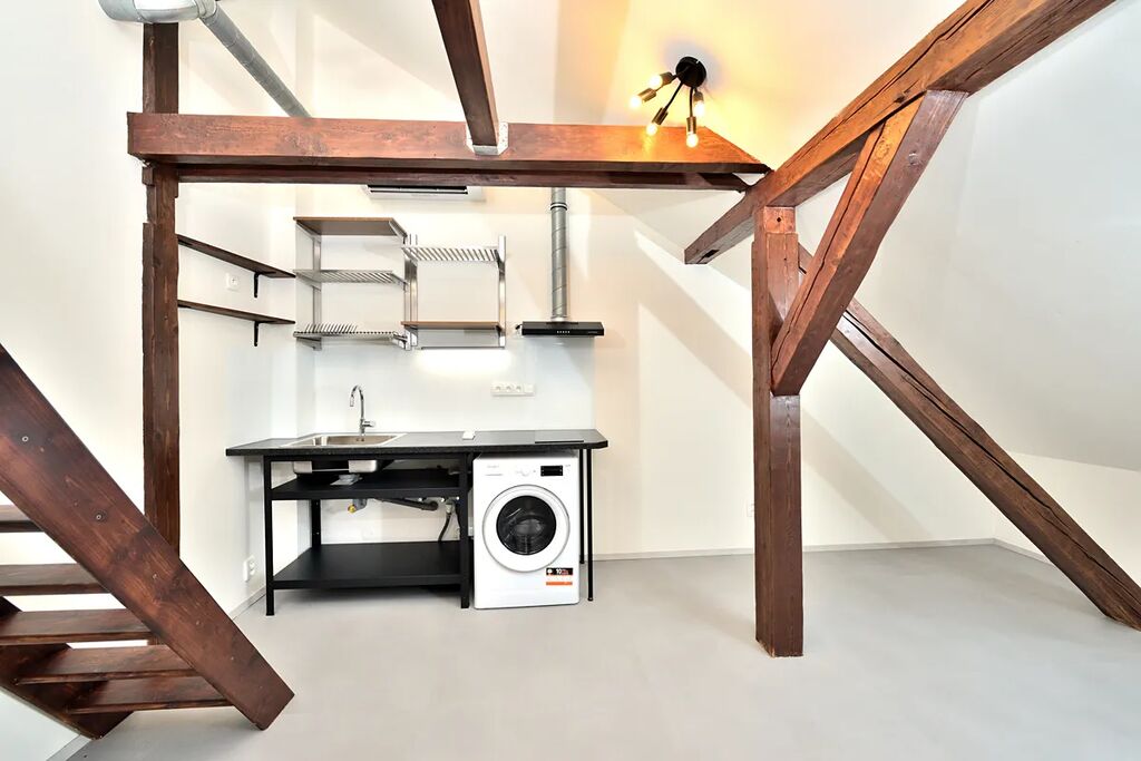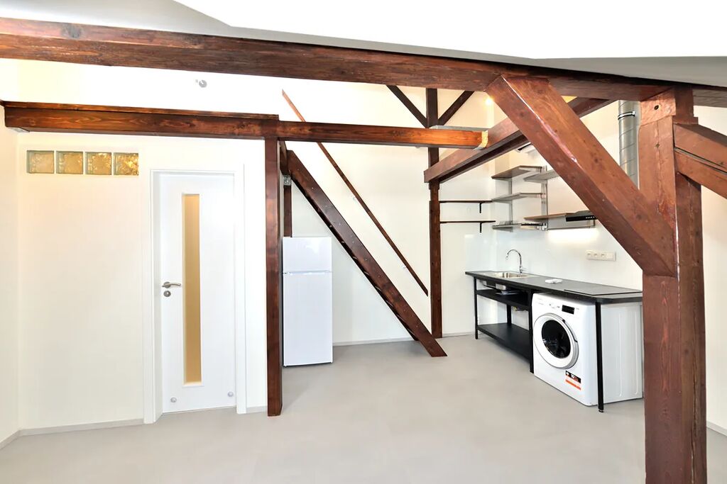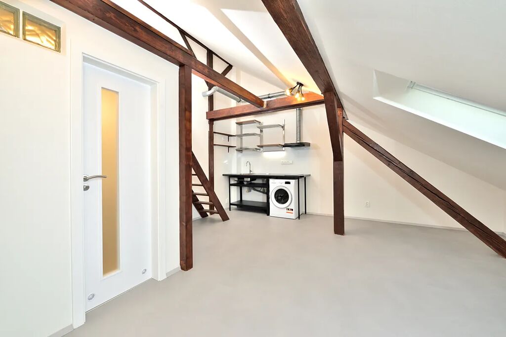 Nabízíme k pronájmu zrekonstruovaný, půdní byt 1+kk o celkové podlahové výměře 38,13 m2. Byt se nachází na čtvrtém patře bez výtahu v klidném činžovním domě v ulici Oldřichova na Praze 2. Kuchyňský kout navazuje na hlavní pokoj se stylovými dřevěnými trámy. V bytě je klimatizace a vybavená kuchyňská linka spotřebiči: indukční elektrická varná deska, myčka na nádobí (myčka zatím není na fotografii), lednice s mrazákem a pračka se sušičkou. Samostatná toaleta je přístupná z předsíně bytu a koupelna se sprchovým koutem má přístup z hlavní obývací místnosti. Díky své členitosti byt má i patro, které lze využít buď jako odkládací prostor, nebo jako prostor ke spaní.
