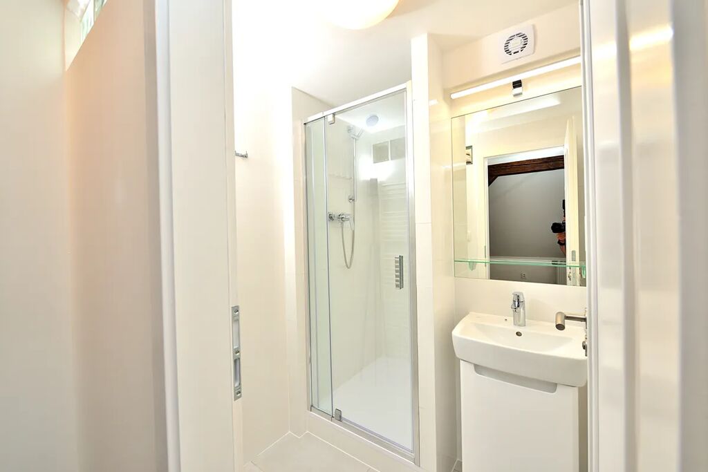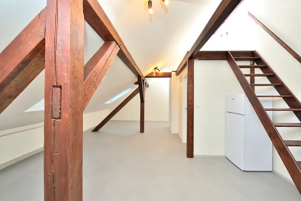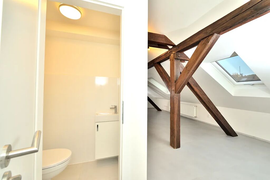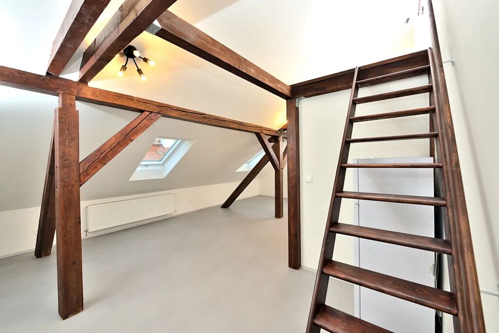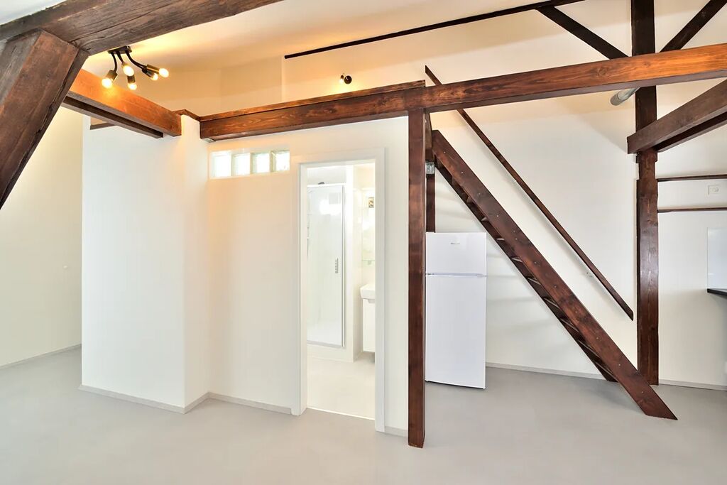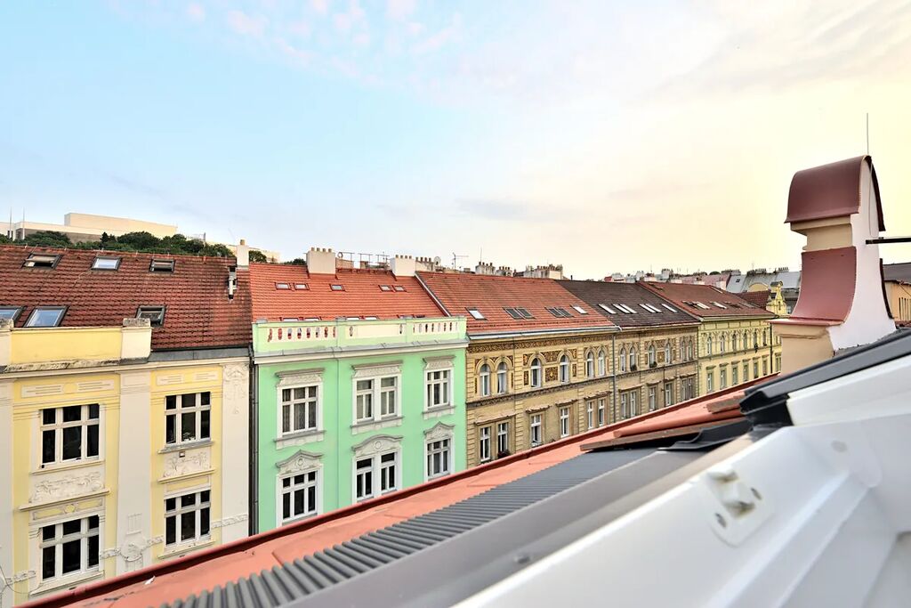 Nabízíme k pronájmu zrekonstruovaný, půdní byt 1+kk o celkové podlahové výměře 38,13 m2. Byt se nachází na čtvrtém patře bez výtahu v klidném činžovním domě v ulici Oldřichova na Praze 2. Kuchyňský kout navazuje na hlavní pokoj se stylovými dřevěnými trámy. V bytě je klimatizace a vybavená kuchyňská linka spotřebiči: indukční elektrická varná deska, myčka na nádobí (myčka zatím není na fotografii), lednice s mrazákem a pračka se sušičkou. Samostatná toaleta je přístupná z předsíně bytu a koupelna se sprchovým koutem má přístup z hlavní obývací místnosti. Díky své členitosti byt má i patro, které lze využít buď jako odkládací prostor, nebo jako prostor ke spaní.