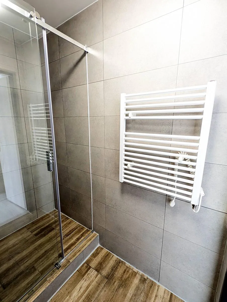 Koupelna je nově obložena velkoformátovým obkladem v neutrálním tónu a vybavena sprchovým koutem, umyvadlem se zrcadlem, toaletou a topným žebříkem. Samozřejmostí je příprava pro připojení pračky.