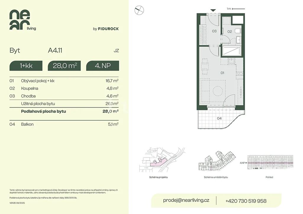 Nabízíme k prodeji byt 1+kk o podlahové ploše 28 m² s balkonem 5,1 m² v developerském projektu NEAR living v Praze 8, vznikajícím na pomezí Palmovky a Karlína.