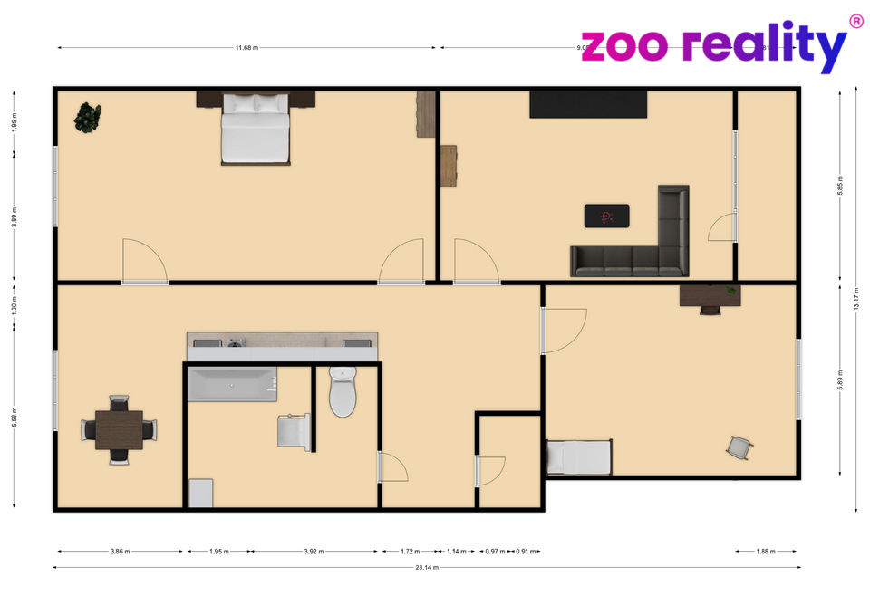 Nachází se zde, vstupní předsíň s šatnou, koupelna z umakartového jádra s vanou, umyvadle a toaletou, kuchyně s kuchyňskou linkou a prostorem pro jídelní stůl. Dále zde najdeme obývací pokoj se zasklenou lodžií, dětský pokoj a ložnice. K bytu naleží sklepní kóje.