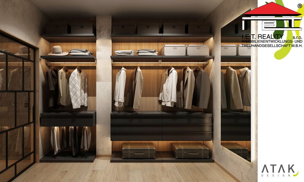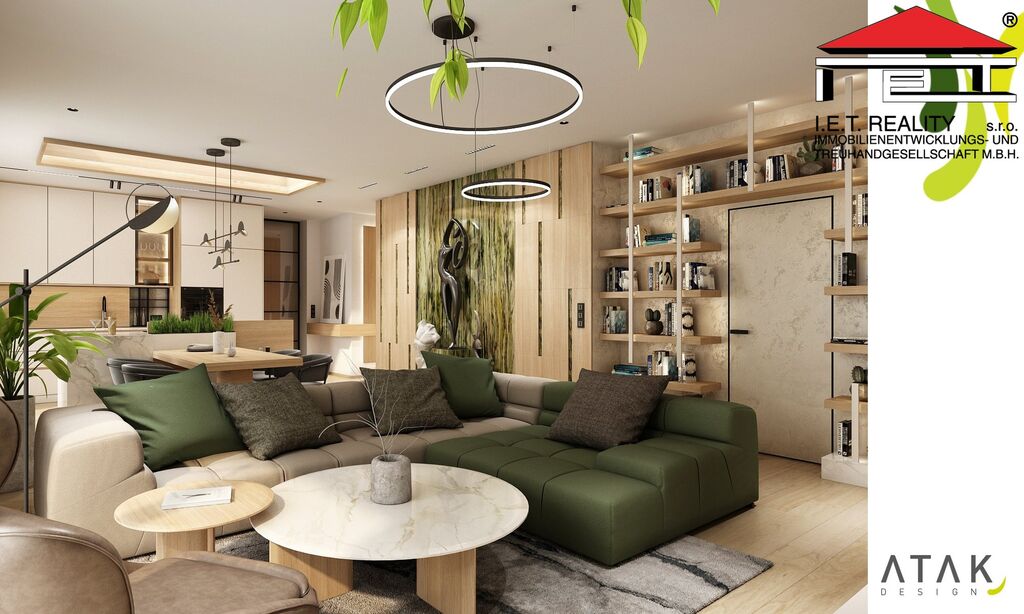 Z předsíně je vstup do samostatného pokoje (šatna, pokoj pro hosty, dětský pokoj) a toaletu. Hlavní obytnou část tvoří světlý obývací pokoj s nadčasovou kuchyňskou linkou s vestavnými spotřebiči. Dále z tohoto pokoje je přímý vstup na prostornou terasu, s výhledem do vnitrobloku. Z obývací části je zároveň vstup i do komfortní hlavní ložnice, která disponuje vlastní koupelnou a šatnou. Některé z fotografií jsou pouze ilustrační vizualizace pro lepší představu o možném uspořádání interiéru.