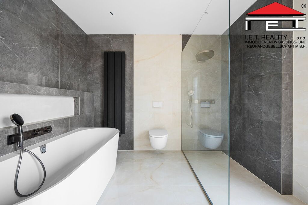 Koupelny: podomítkové baterie HansGrohe RainSelect v kartáčovém černém designu, hlavová sprcha, HansGrohe, černý chrom, závěsné WC, vana se zástěnou s napouštěním z přepadu, Villeroy & Boch. Velkoformátová dlažba a obklady, podlahové vytápění.