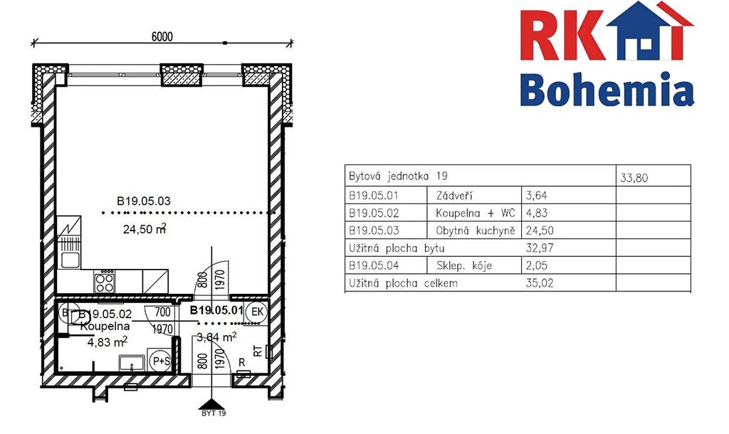 Byt se nachází v 5. NP pětipodlažního domu s výtahem a má výměru 32,97 m2. Skládá se ze zádveří (3,64 m2), koupelny se sprchovým koutem a WC (4,83 m2) a obývacího pokoje s kuchyňským koutem (24,5 m2). K bytu náleží sklepní kóje (2,05 m2) a venkovní parkovací stání.