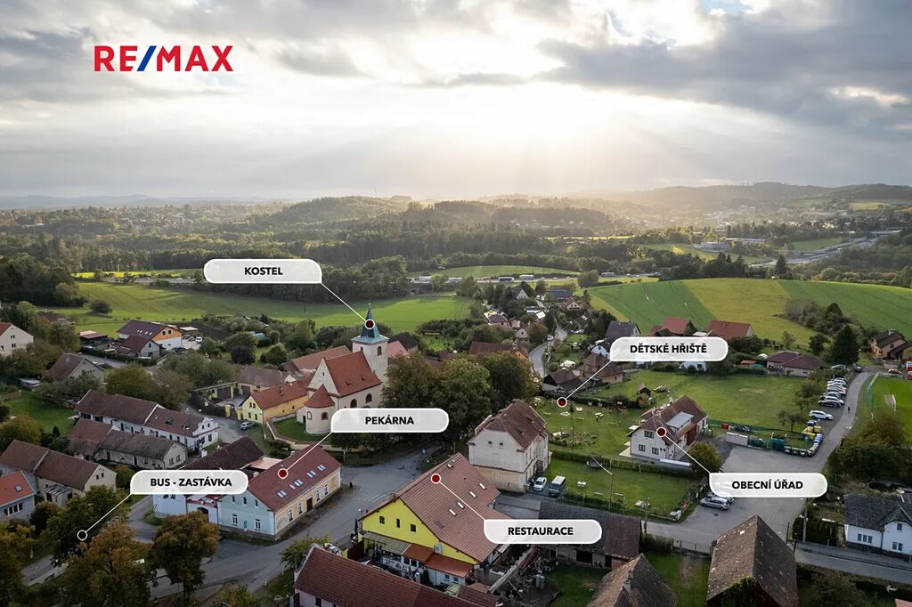 Vše potřebné najdete do 50m od dveří: hospodu, obchod, pekárnu, školku, dětské hřiště, kostel.