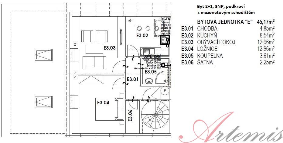 V bytě se nachází přízemí se zádveřím (boty, šatna). Po schodišti nahoru přicházíte do obytné části, kde se nachází kuchyně, koupelna s WC a sprchovým koutem, 2 pokoje.