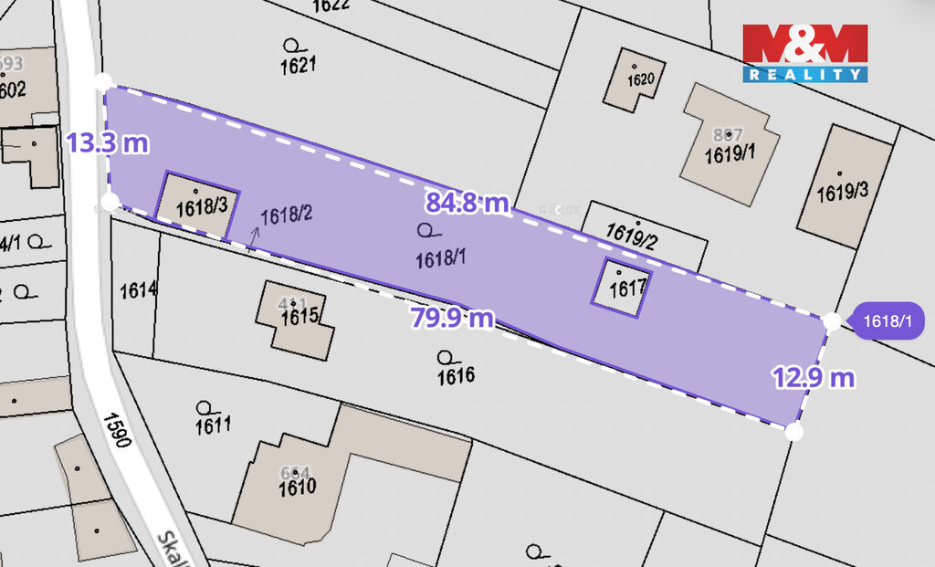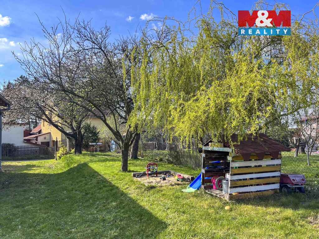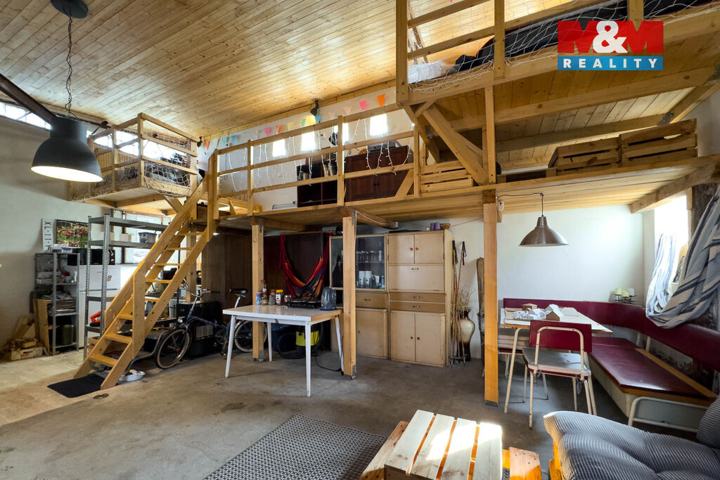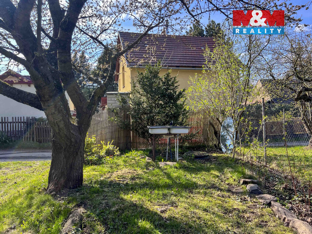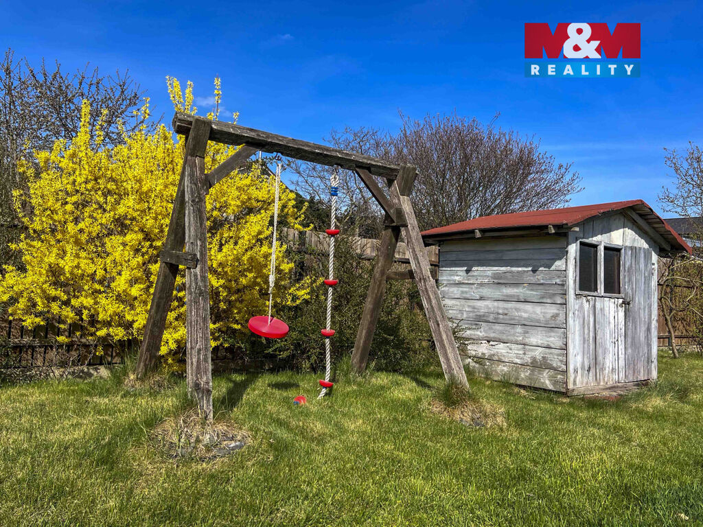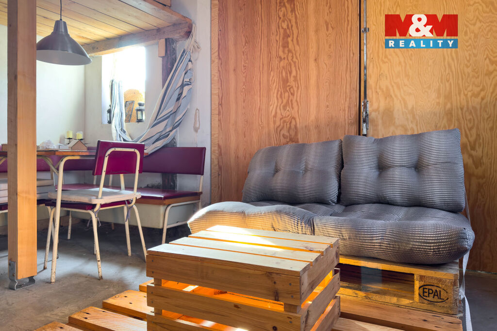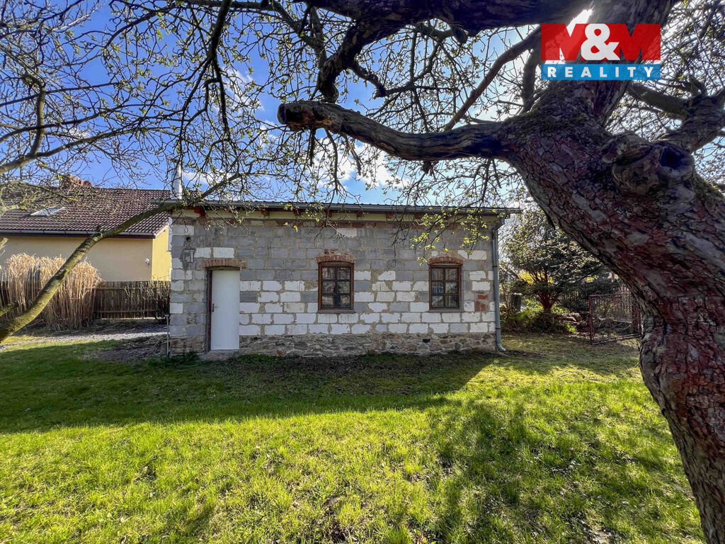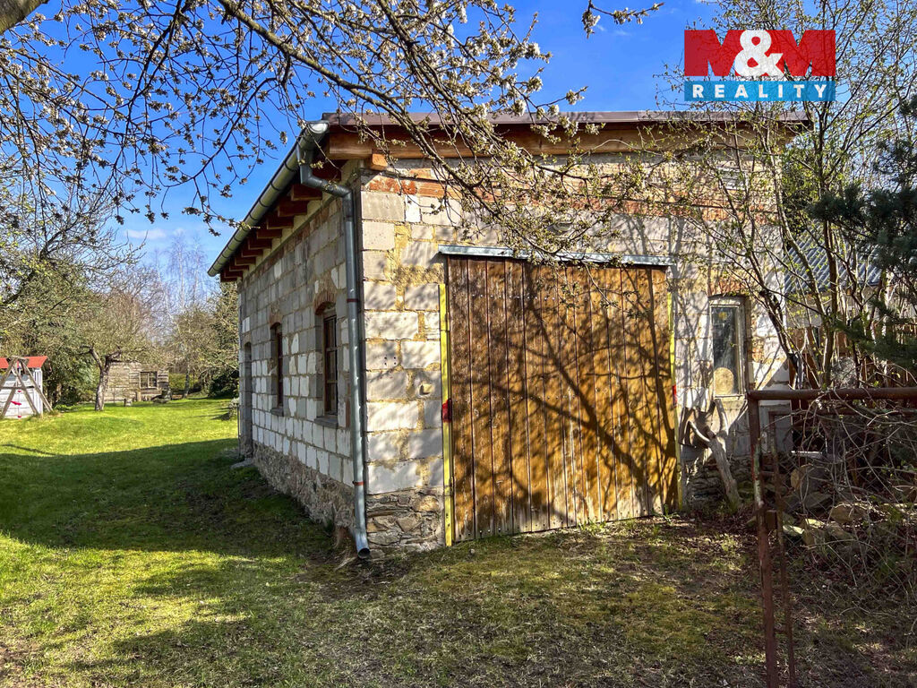 Součástí pozemku je zděná stavba (42 m²), která slouží jako víkendový domek s dřevěným patrem, zavedenou vodou a vytápěním kamny – ideální jako dočasné bydlení během stavby či jako rekreační objekt. Nechybí ani praktický dřevěný domek pro uskladnění materiálu v zadní části a malá kůlna.