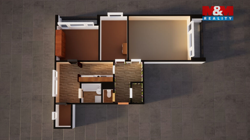 Byt je z větší části v původním, ale velmi zachovalém stavu. Výhodou jsou dvě samostatné lodžie – jedna náleží k ložnici, druhá k obývacímu pokoji.