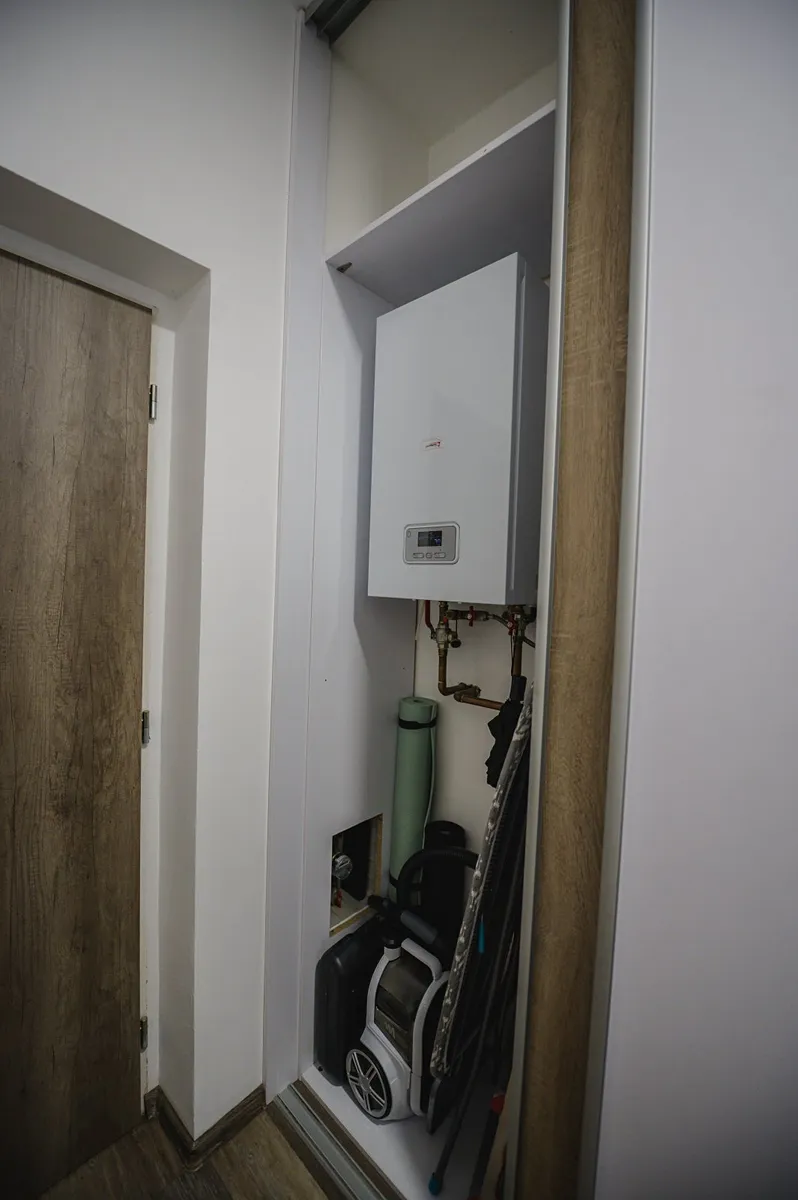 Výměra bytu je cca 46m2 . Po vstupu do bytu je prostorná předsíň se vstupy do koupelny s WC a kuchyně. V předsíni jsou na míru vyrobené vestavěné skříně, kde je mimo úložného prostoru na oblečení i místo na elektrokotel, bojler na ohřev vody a místo na pračku. Koupelna má sprchový kout, umyvadlo a WC. Dále je z předsíně vstup do kuchyně a za ni je velký pokoj se 2 okny.
