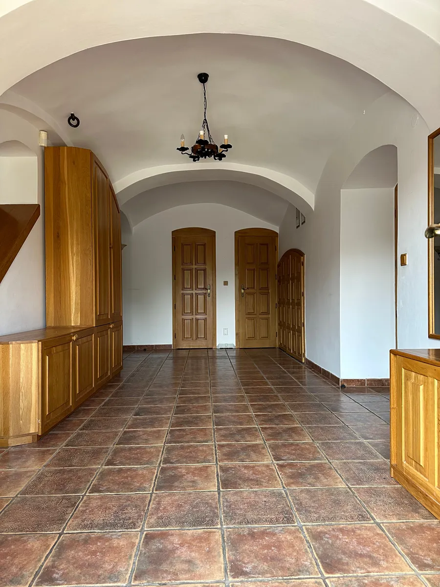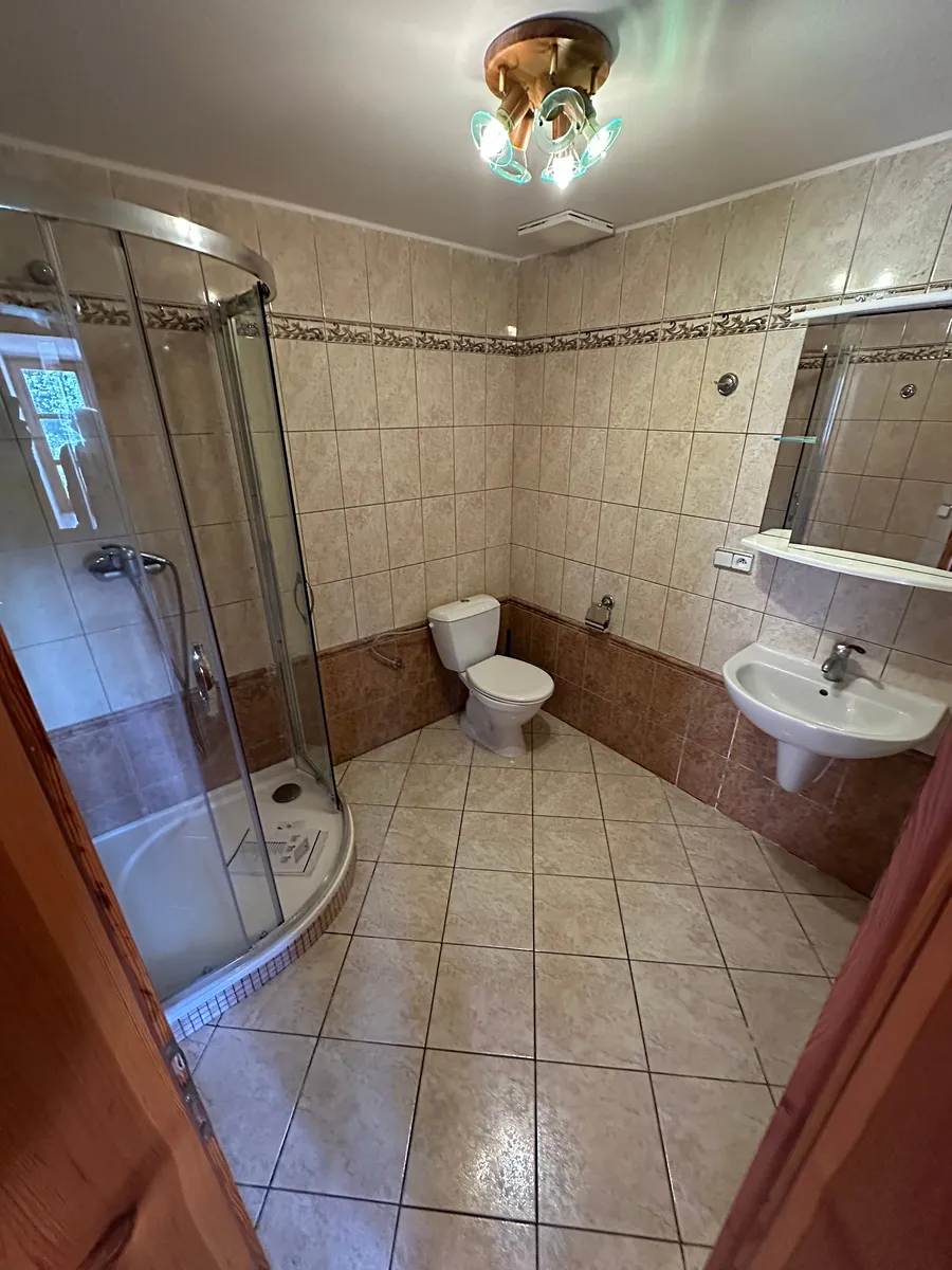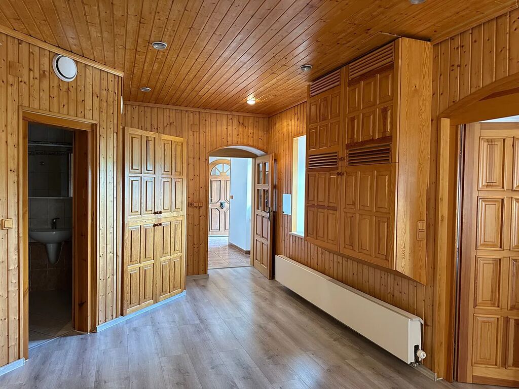 II.NP – schodiště, pokoj, pokoj, koupelna s WC, šatník, ložnice s vlastní koupelnou a WC, samostatný byt 1KK s předsíní a koupelnou s WC, velká místnost (herna), chodba, lodžie po celé délce domu. Z lodžie je možný vstup do vedlejší stodoly (garáž) s podkrovní hernou (pánský klub) a venkovním posezením s krbem.