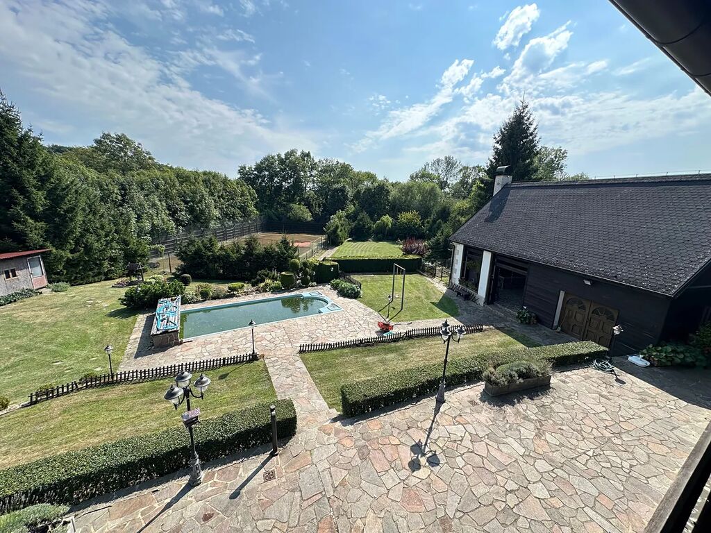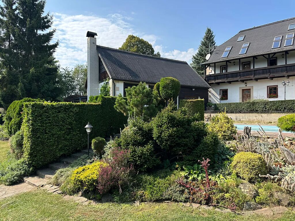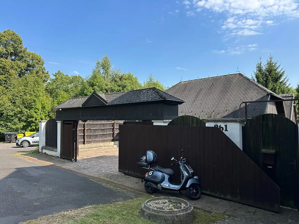 Zahrada: profesionálně uspořádaná, osázena vzrostlými okrasnými keři a stromy, oplocena s vjezdovými dřevěnými vraty na DO, bazén 8,5m*3,8m*1,5m s čerpadlem a filtrací, stodola, garáž, přístřešek na dřevo, vlastní studna na pitnou vodu, ČOV, drobné stavby, rozvod užitkové vody.