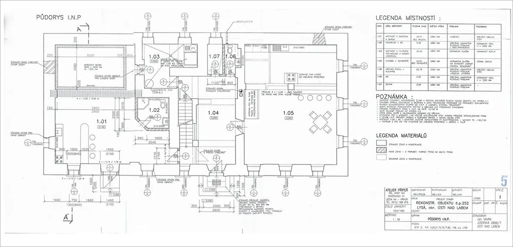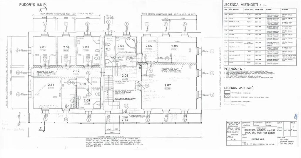 I.NP – vstup, chodba, obývací pokoj propojený s kuchyní (spíš), šatník, místnost z bazénem, barem a koupenou s WC, místnost s filtrační technologií a technologií pro tepel. Čerpadlo, WC.