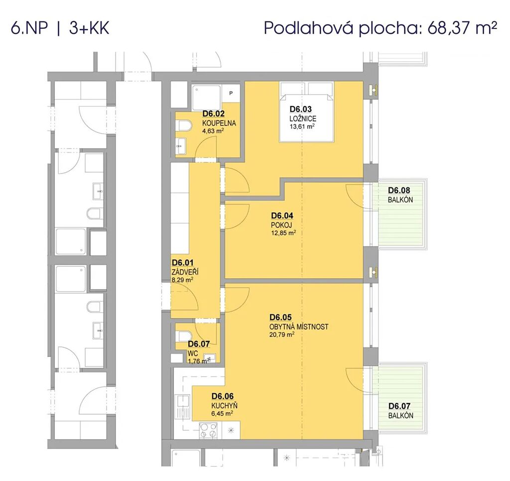 Součástí pronájmu je garážové stání, sklepní kóje a dva prostorné balkony (každý o výměře 6,08 m).