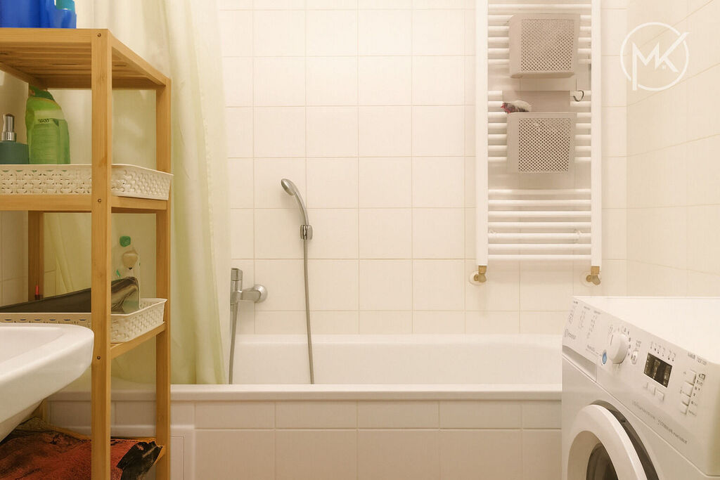 Koupelna s novou vanou, samostatné WC, nová pračka.