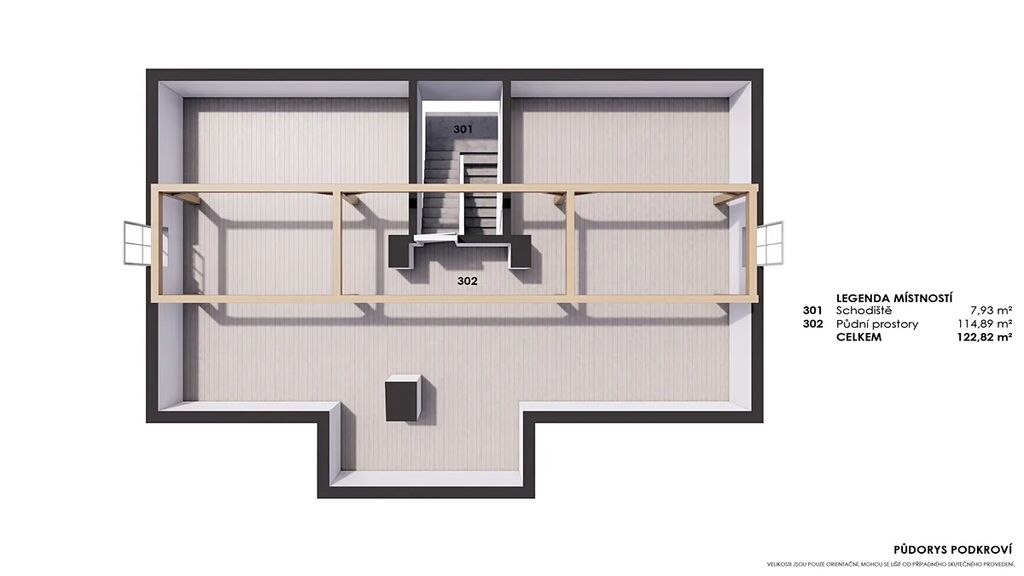 Podkroví má vysokou světlou výšku a nabízí prostor pro rozšíření o další obytnou část nebo velkorysé úložné prostory. Na pozemku se dále nachází volně stojící garáž a samostatná přístavba – technická místnost / zahradní domek. Dům je určen ke kompletní rekonstrukci, nicméně je udržovaný, čistý a kompletně vyklizený.