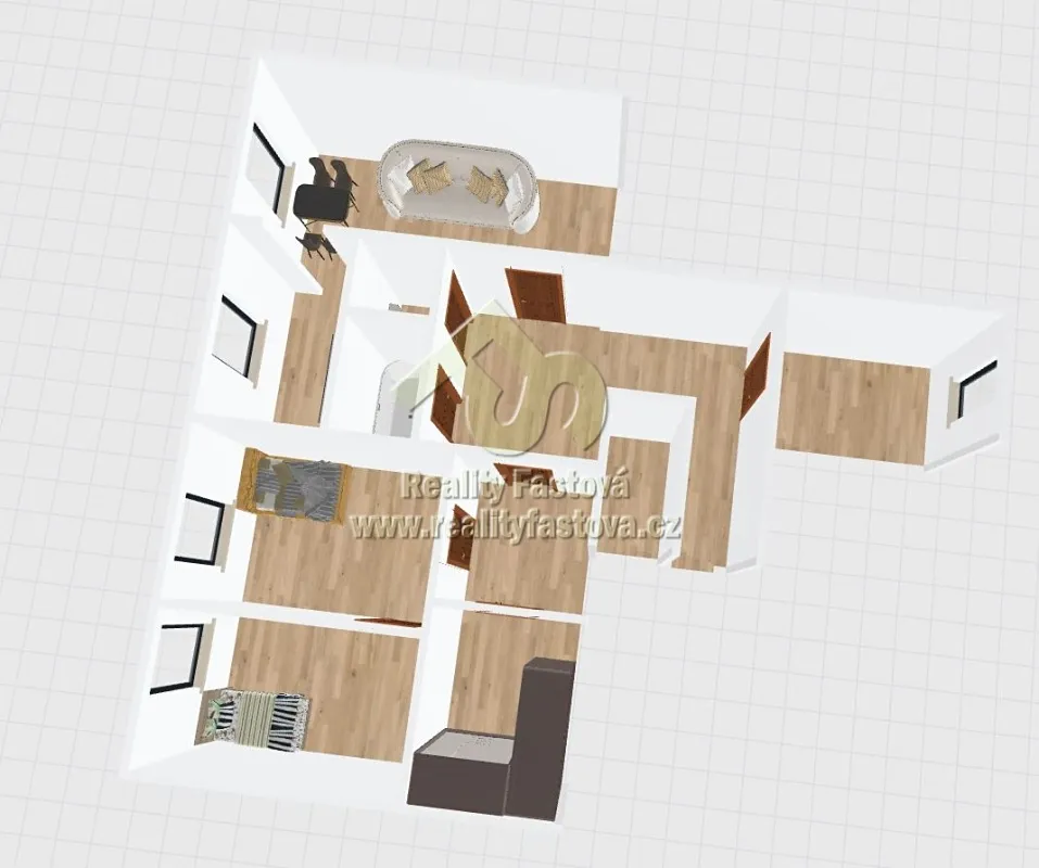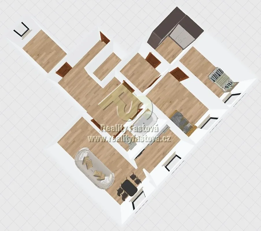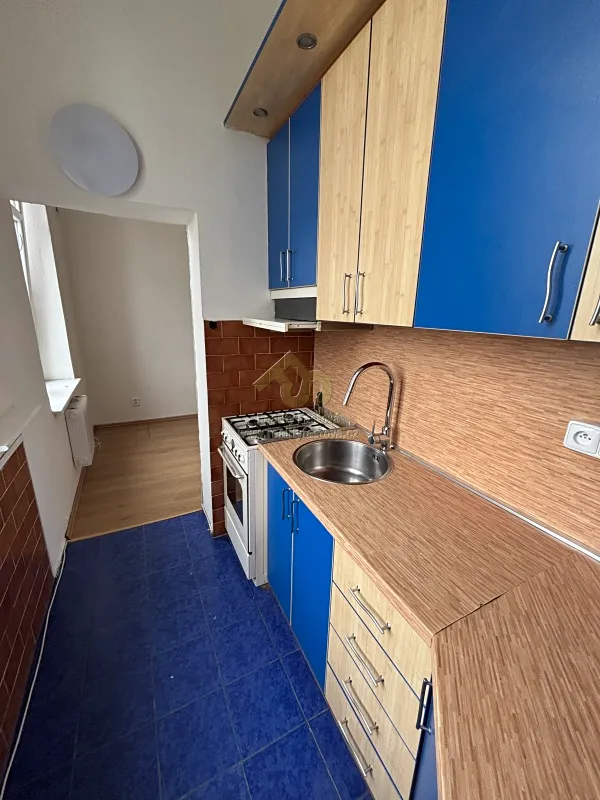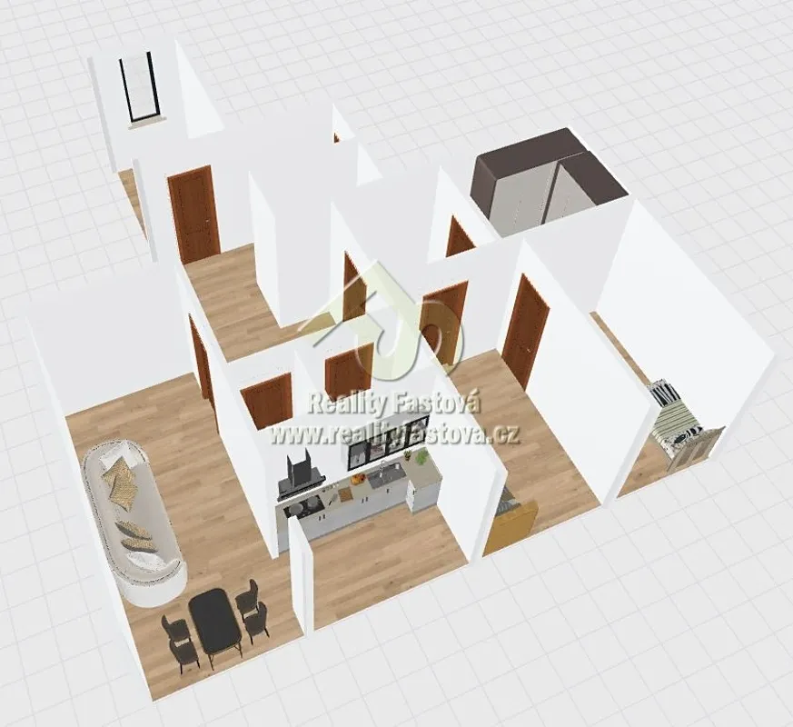 - Samostatný prostorný obývací pokoj, ze kterého je vstup do menší kuchyně. Nicméně v obývacím pokoji lze umístit i jídelní část a obývací část