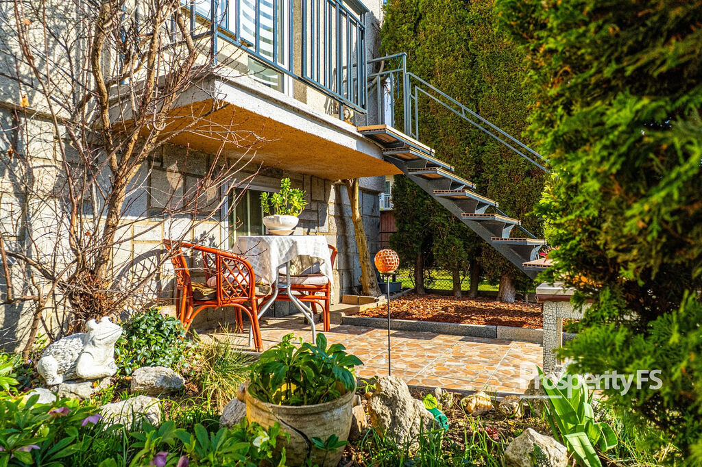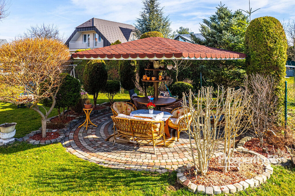 Zahrada o rozloze 800 m² je pečlivě udržovaná, doplněná o letní altán a praktickou spižírnu pro uskladnění ovoce a zeleniny.