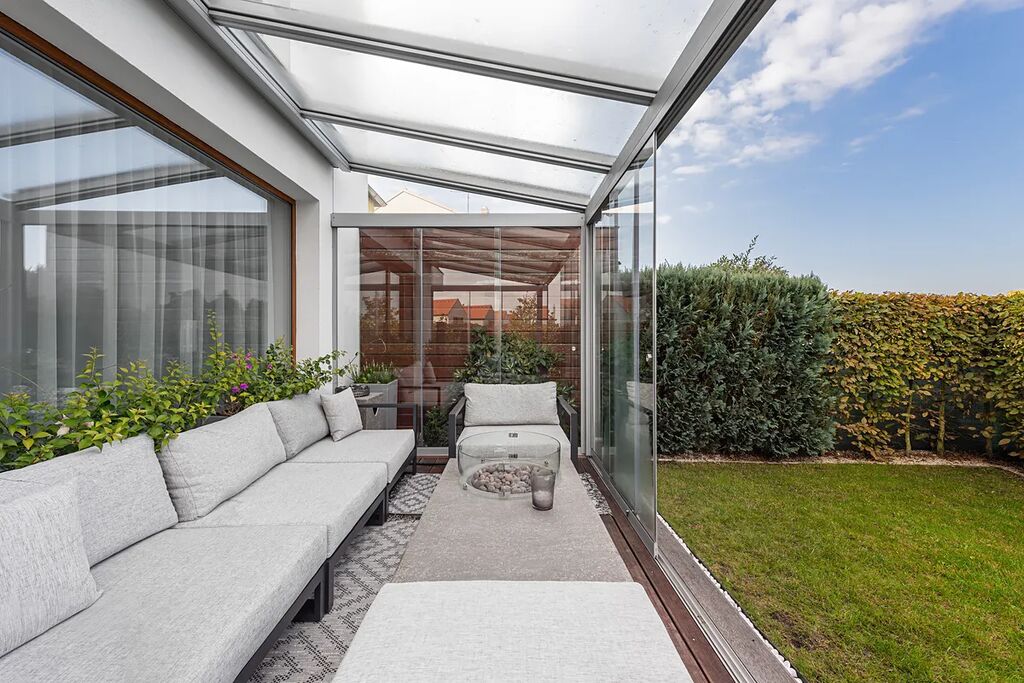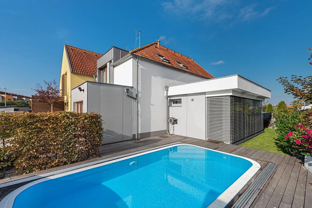Nadstandardní rodinný dům o dispozici 7+kk a užitné ploše 167 m² se nachází v klidné rezidenční části obce Drahelčice, pouhých několik minut od Prahy. Nemovitost nabízí harmonické propojení moderní architektury, precizního zpracování a komfortu rodinného bydlení s důrazem na detail, funkčnost i estetiku. Dominantou přízemí je světlý obývací pokoj s krbem a kuchyní vybavenou spotřebiči Miele a vinotékou, plynule navazující na zimní zahradu a společenskou místnost s celoskleněnými stěnami, které otevírají interiér do pečlivě udržované zahrady. Součástí přízemí je dále vstupní hala s šatnou a vestavěnými skříněmi, toaleta, ložnice a samostatná prádelna. Elegantní dřevěné schodiště s nerezovým zábradlím vede do patra, kde se nachází hlavní ložnice s vlastní koupelnou, dva dětské pokoje a druhá koupelna s vanou a dvojumyvadlem.  K vysokému standardu vybavení patří dřevěné podlahy v dekoru šedého dubu, bezfalcové dveře v bílém laku, hliníková a plastová okna s trojsklem, designové koupelny s italskou keramikou a sanitou Hansgrohe, venkovní žaluzie a vytápění kombinující podlahové topení, konvektory a radiátory s plynovým kotlem. Komfortní zázemí této výjimečné nemovitosti doplňují venkovní terasy z exotického dřeva massaranduba, vyhřívaný bazén se slanou vodou (8×4 m) s protiproudem a zastřešením, elektricky ovládaná posuvná brána, zahradní domek a dvě venkovní parkovací stání na zpevněné ploše před domem. Pečlivě udržovaná zahrada nabízí maximální soukromí, klid a příjemné posezení. Drahelčice jsou oblíbenou rezidenční lokalitou s rychlým spojením do Prahy a plnou občanskou vybaveností. V blízkosti se nachází mateřská a základní škola, sportoviště, restaurace, dětská hřiště i přírodní okolí vhodné pro rekreaci. Do centra Prahy se pohodlně dostanete autem do 20 minut nebo MHD – zastávka je v docházkové vzdálenosti.