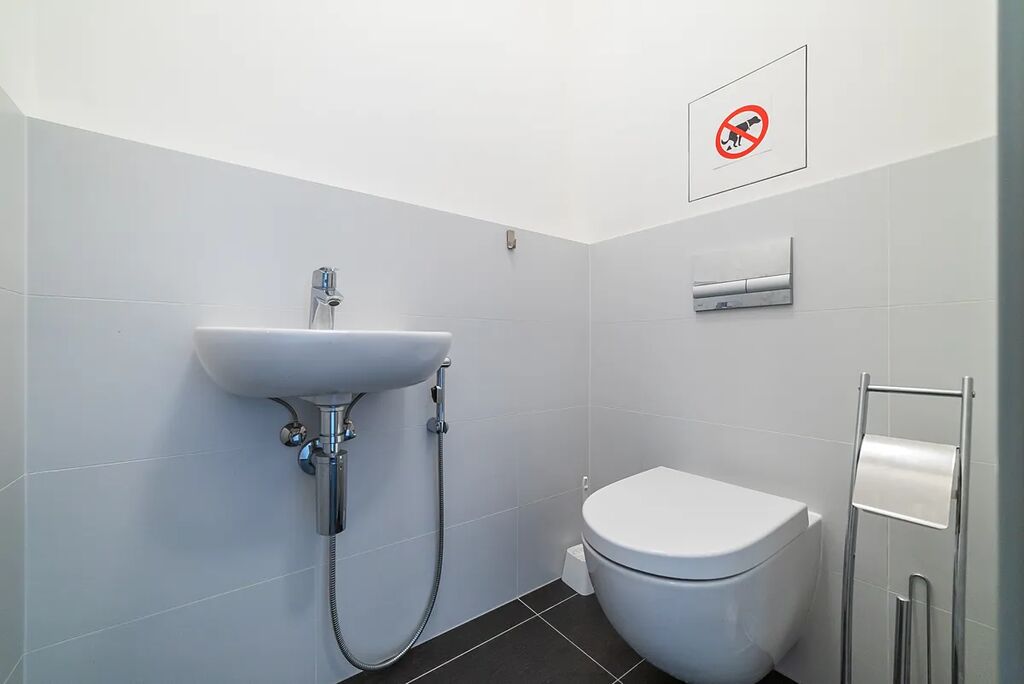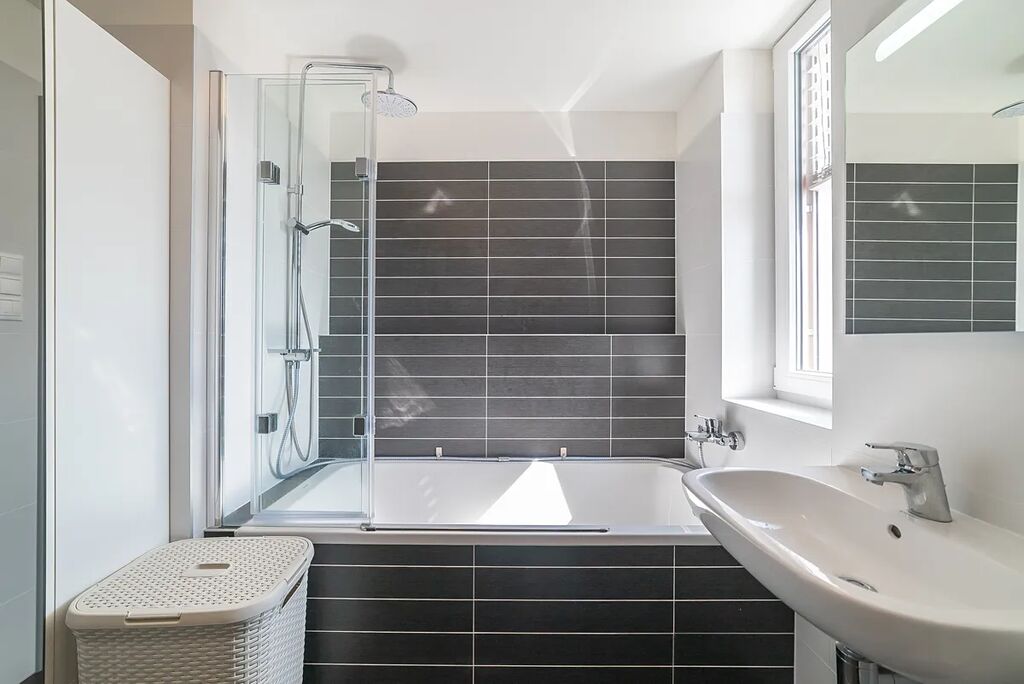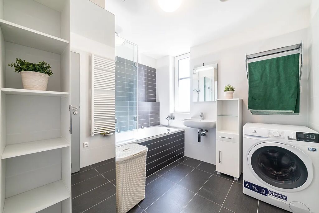 Koupelna je prostorná, vybavená vanou, pračkou a dostatkem úložných prostor. Toaleta je oddělená.