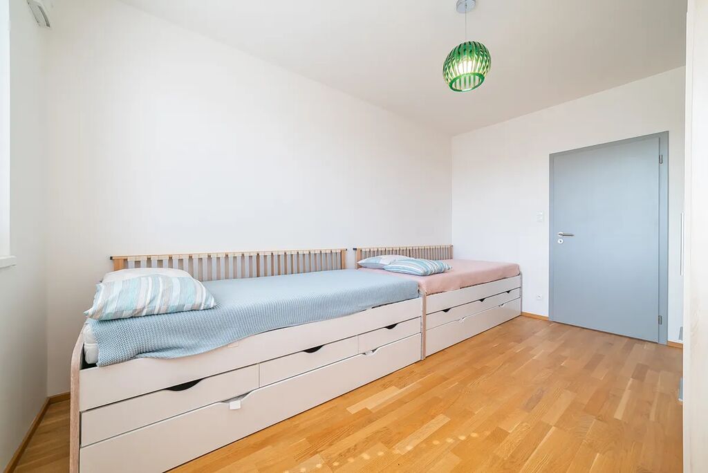 Dětský pokoj nabízí dvě jednolůžkové postele s úložným prostorem, šatní skříň a pracovní stůl se židlí.
