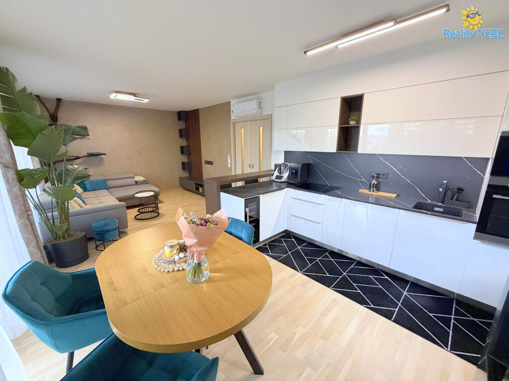 Byt je nabízen jako zařízený dle fotografií, jeho dominantou je prostorný obývací pokoj se vstupem na balkon o velikosti 11m2 a západním výhledem na Prahu 5; dále plně vybaveným kuchyňským koutem (kuchyňská linka s barovým pultem a vestavnými spotřebiči - indukční varná deska, el. trouba, myčka nádobí a nakonec americká lednice, a vestavná vinotéka).