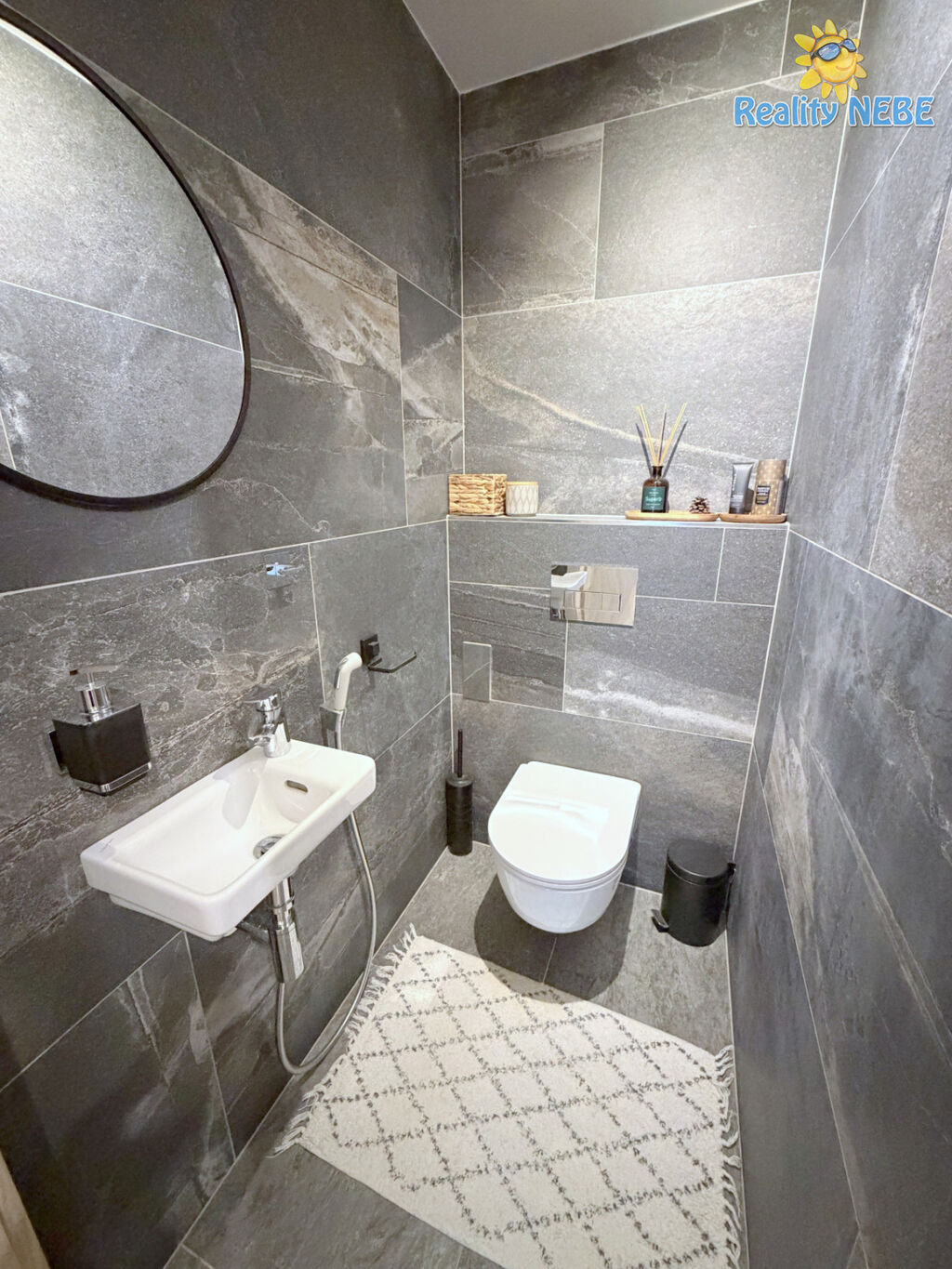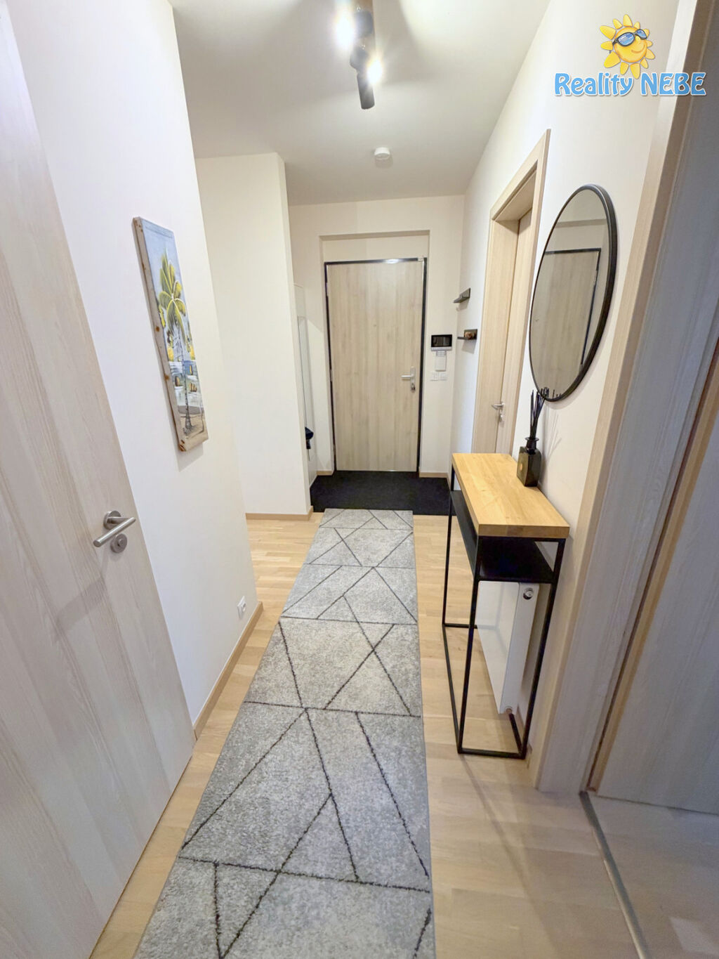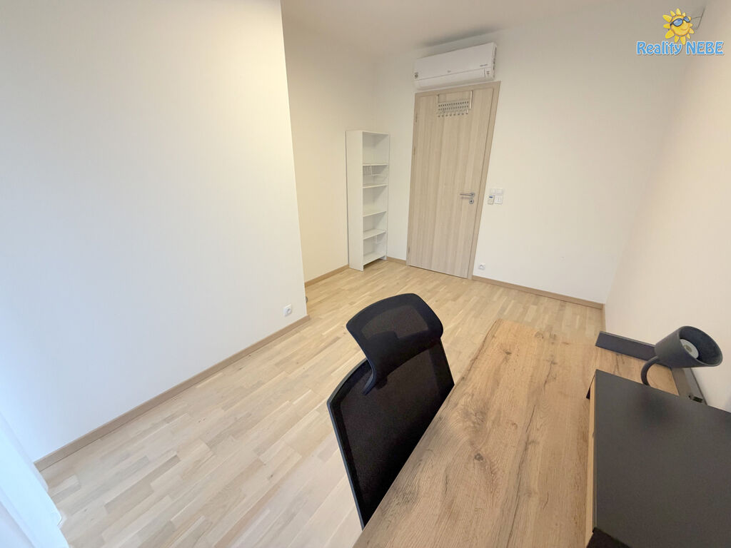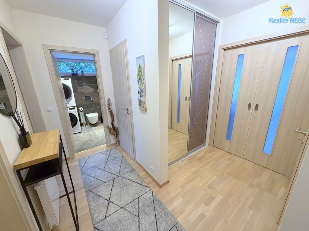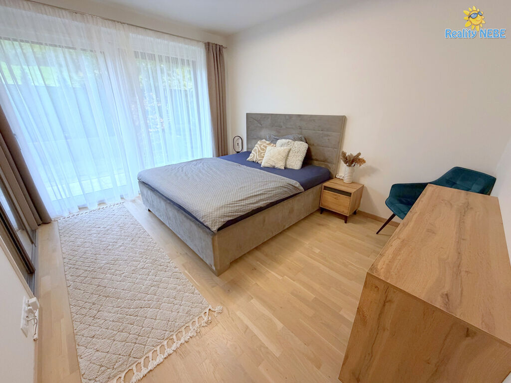 Dvě samostatné ložnice, obě se vstupem na terasu 10m2 na východní stranu. Stylová koupelna s vanou, WC a pračkou. V bytě další samostatné WC. Dostatek úložných prostor zajišťuje komora v bytě, vestavné šatní skříně a sklep v suterénu domu. Byt je vybaven klimatizační jednotkou (celkem 3x - obývací pokoj a obě ložnice), připojením k internetu a zabezpečovacím systémem. V ceně nájmu je také 1x kryté garážové stání a 2x privátní venkovní stání.