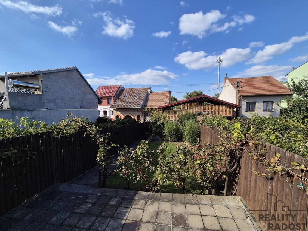 Za domem se rozprostírá prostorná terasa a okrasná hezky udržovaná zahrada.