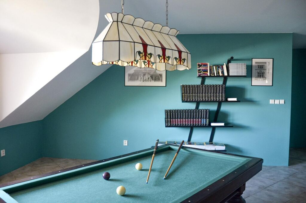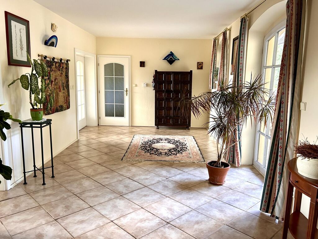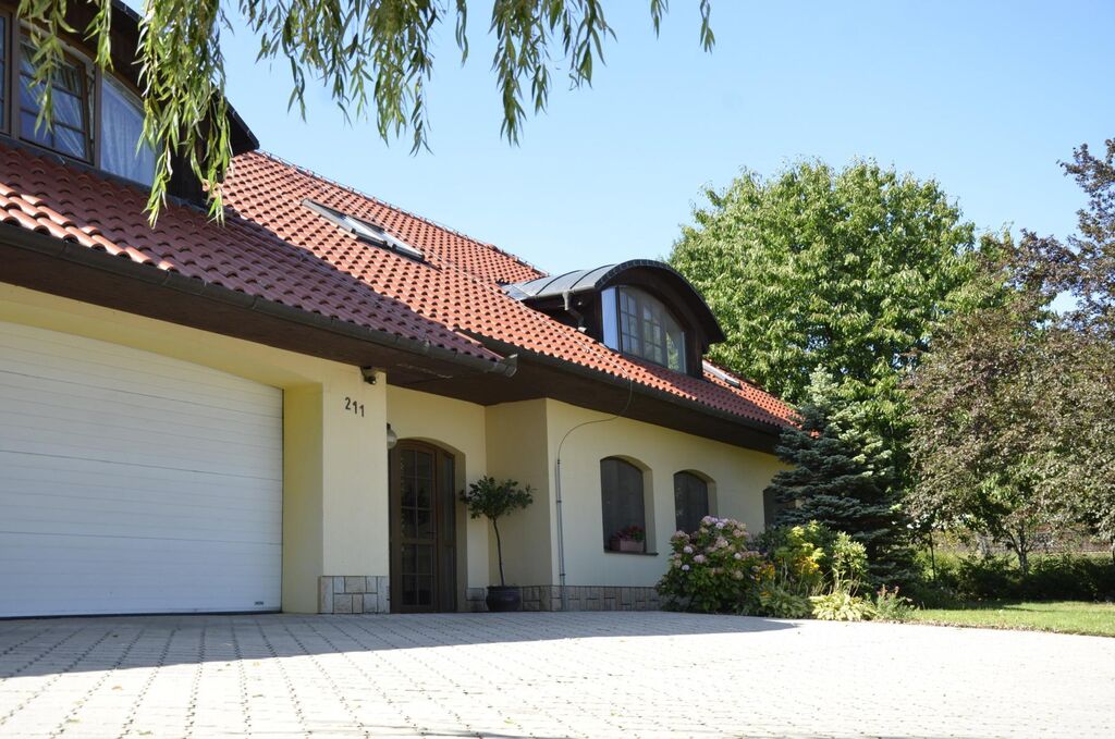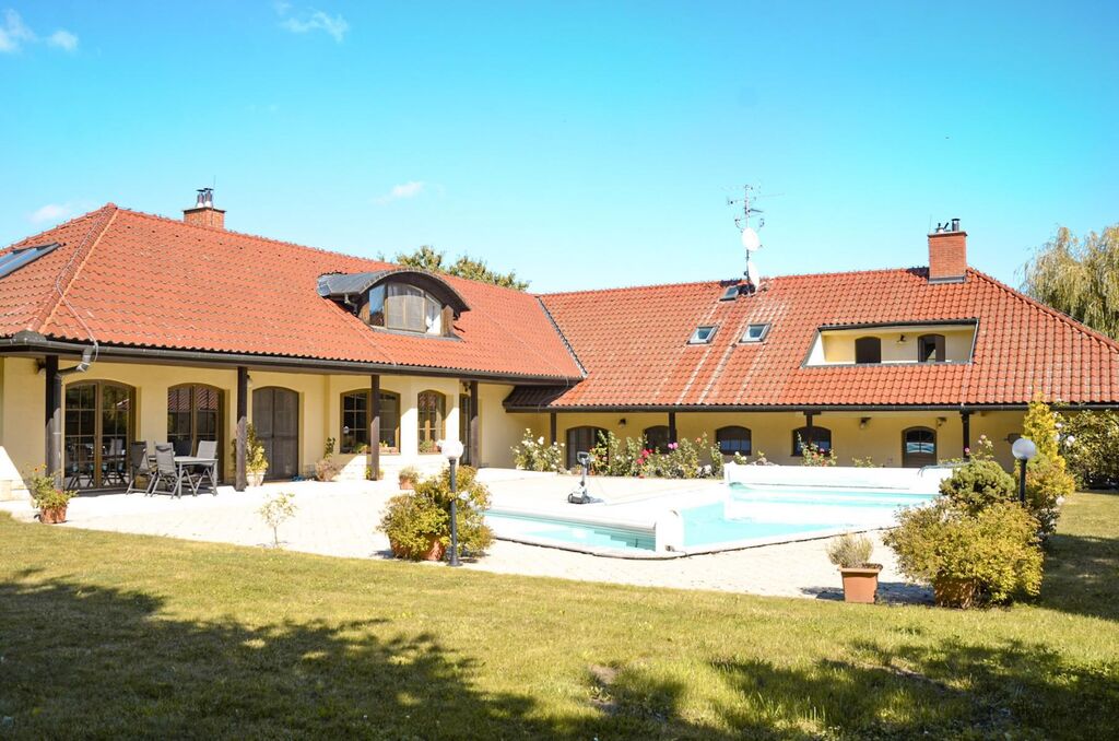 Najdete zde vyhřívaný bazén 12 × 5,5 m s lamelovým zakrytím, automatické zavlažování a zahradní osvětlení.