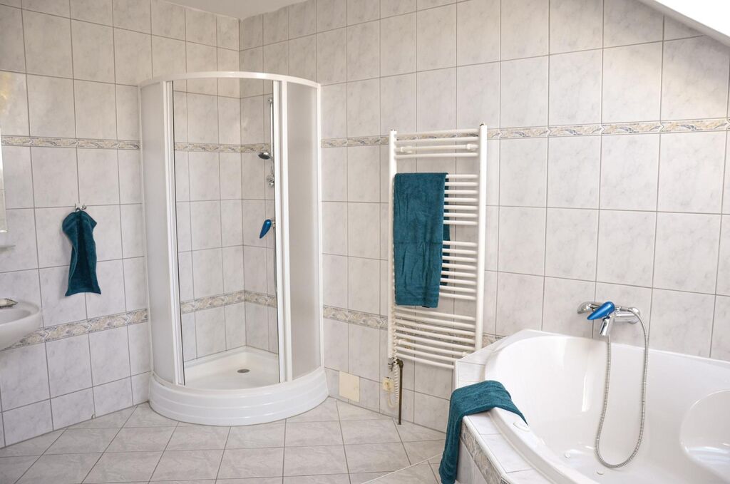 Podlahové vytápění v obývacím pokoji, kuchyni, koupelnách i chodbách.