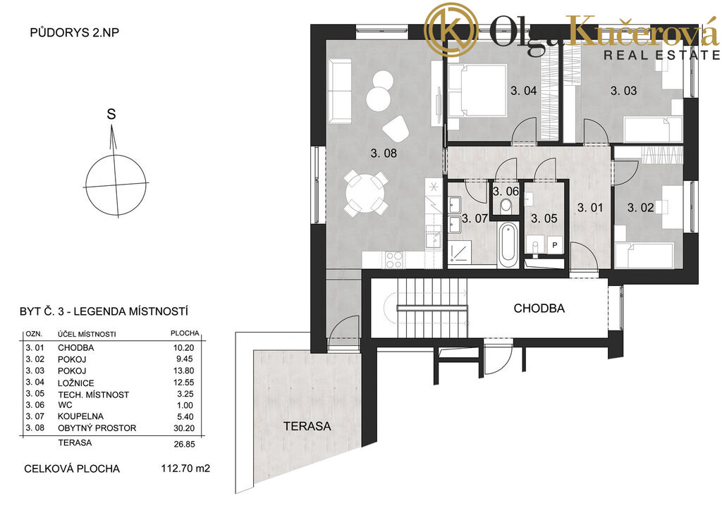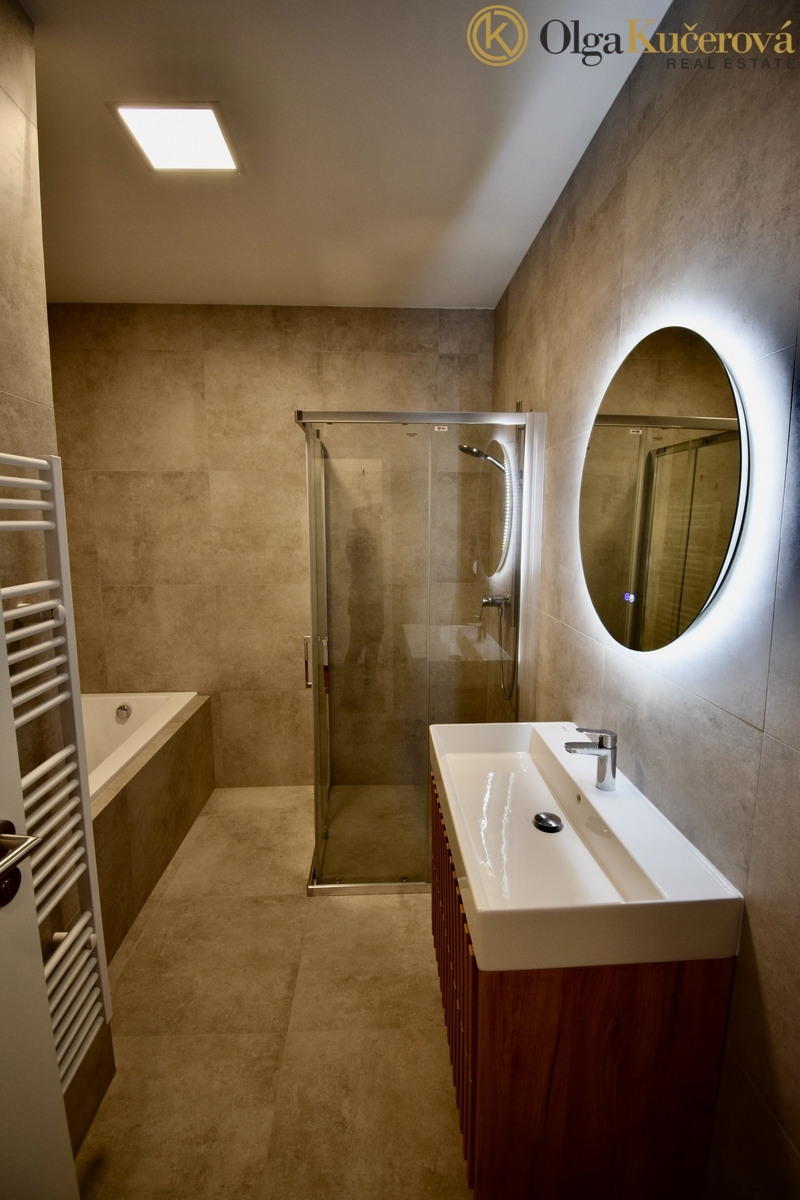 Byt o dispozici 4+kk a výměře 113 m² je situován v 1. patře jihozápadní části domu. Dispozičně nabízí tři ložnice, prostorný obývací pokoj s kuchyňským koutem a přímým vstupem na velkorysou terasu o výměře 27 m². K dispozici je dále koupelna s vanou i sprchovým koutem, samostatné WC a technická místnost s prádelnou.