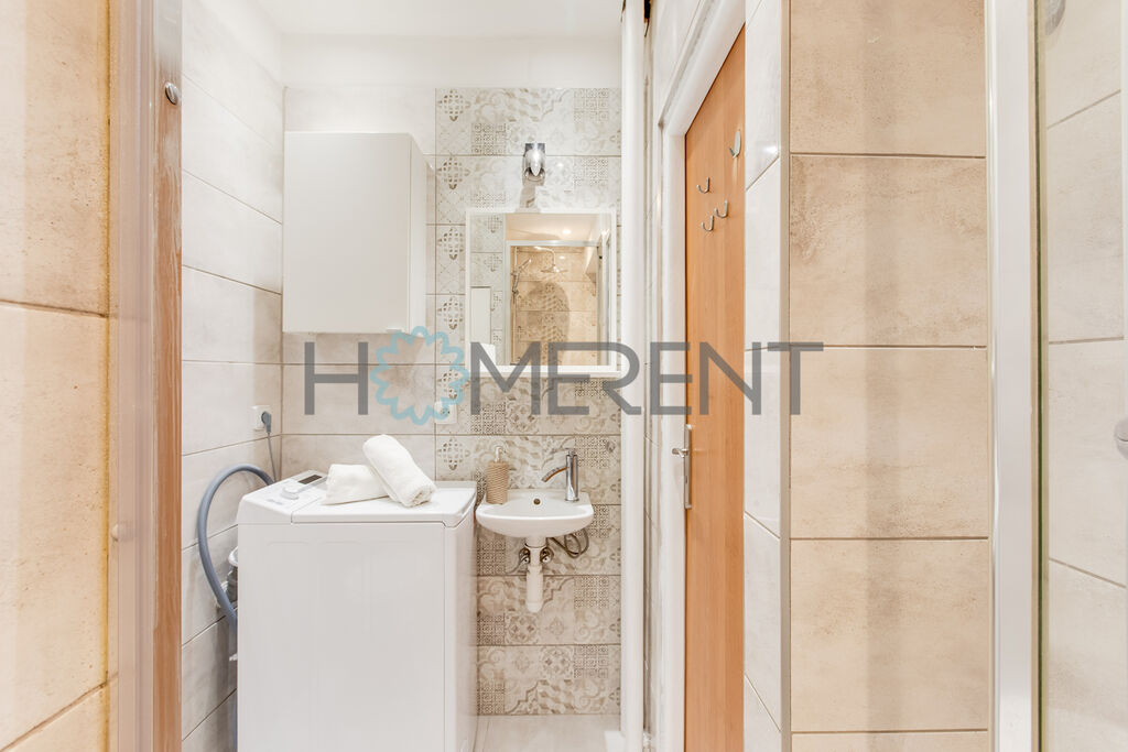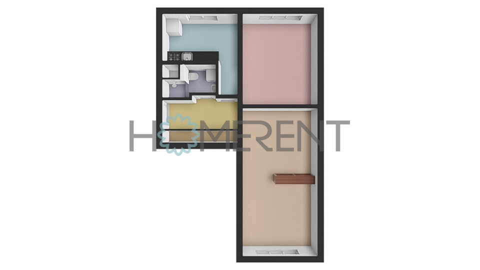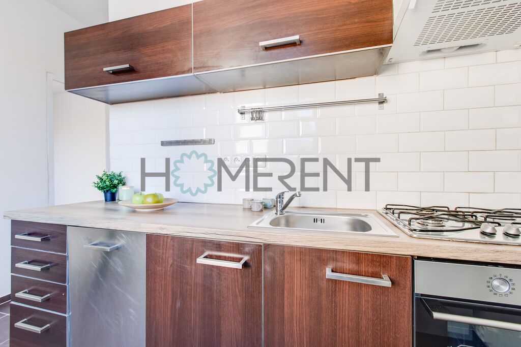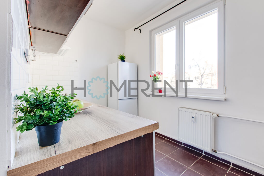 Byt má velmi praktickou dispozici: dvě samostatné, nevybavené místnosti s dostatkem denního světla a výhledem do ulice, samostatnou vybavenou kuchyní s lednicí, myčkou, sporákem, koupelnu po rekonstrukci se sprchovým koutem, pračkou a samostatným WC. V chodbě se nachází vestavěné skříně s dostatkem úložného prostoru.