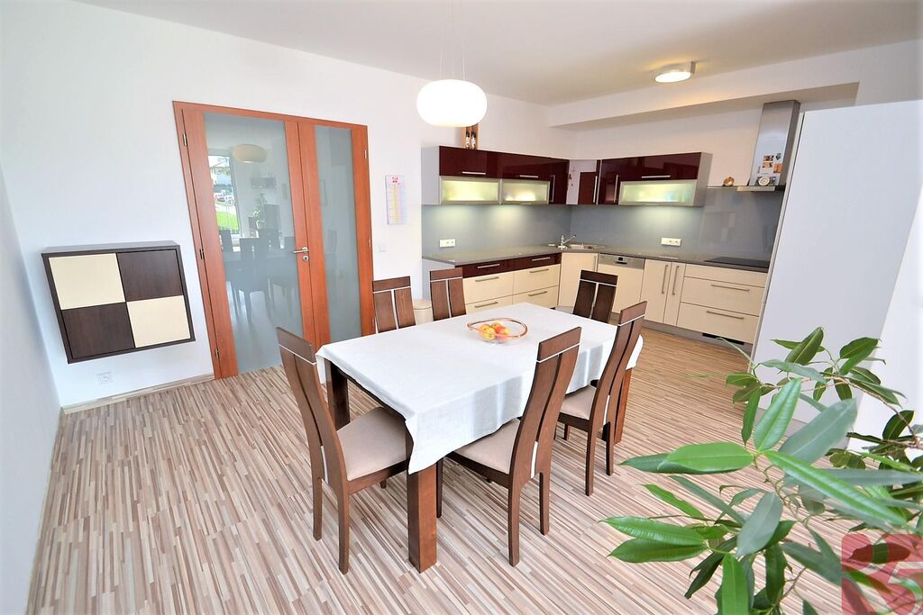 Velký kuchyňský kout s vestavěnými spotřebiči navazuje na jídelnu a obytnou část prosvětlenou velkými francouzskými okny kterými projdete na terasu s výhledem do zeleně.