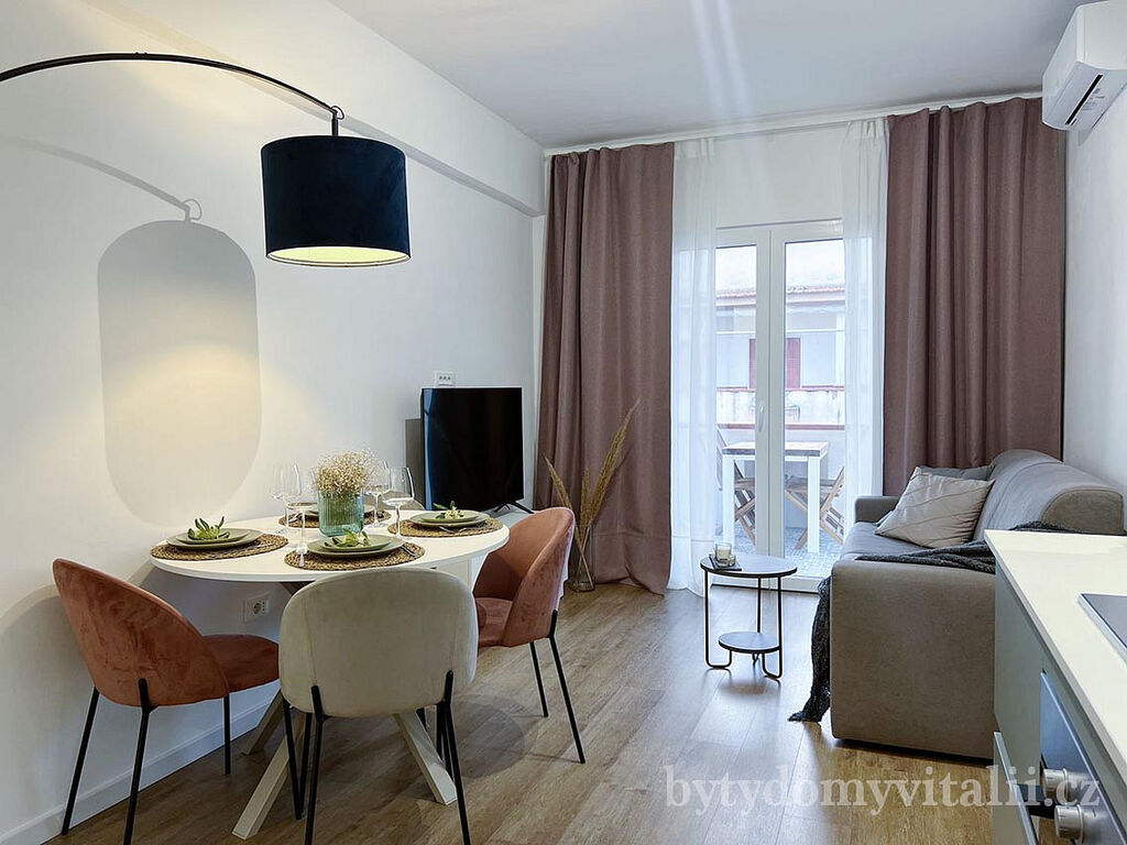 Nabízíme k prodeji třípokojový byt s terasou ve třetím patře bytovém komplexu Parco Centro Marina. Je kompletně zrekonstruovaný a vybavený klimatizací a novým nábytkem, ve spojení moderního stylu, pohodlí a funkčnosti. Skládá se z velké ložnice, malé ložnice (která může být pracovnou), obývacího pokoje s prostornou moderní kuchyní. K bytu náleží i prádelna s pračkou a sušičkou.