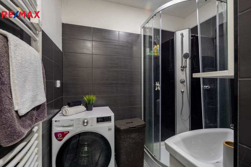 ✅ Zvětšená koupelna se sprchovým koutem, moderní obklady, dlažba, místo pro pračku ( pračka není součástí prodeje)