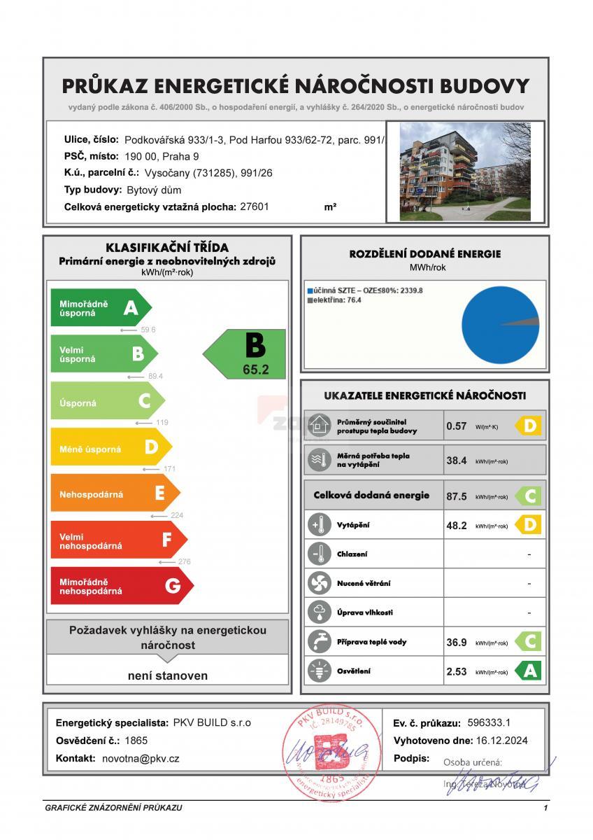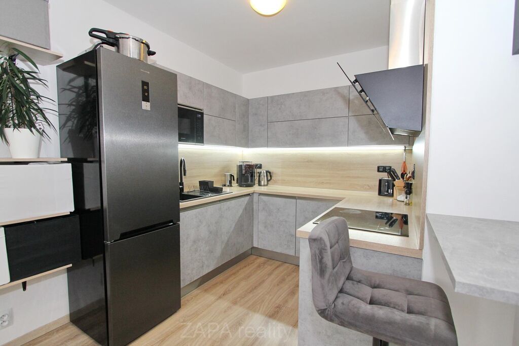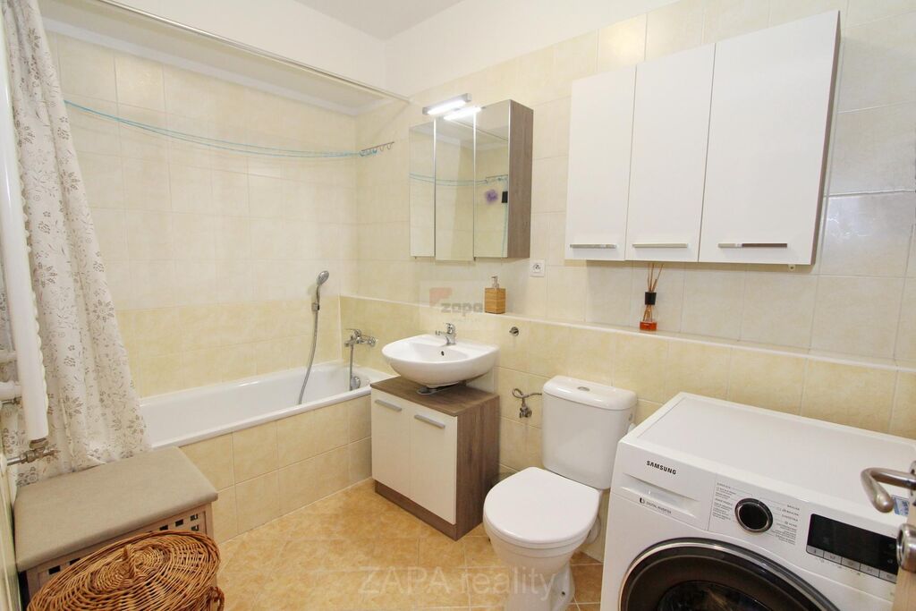 Byt v 7. nadzemním podlaží cihlového domu s výtahem je kompletně zařízen - kuchyňská linka s indukční deskou, elektrickou troubou, mikrovlnnou troubou, myčkou a lednicí + veškerý nábytek na fotografiích + pračka. V místnostech je plovoucí podlaha, v koupelně a na chodbě dlažba, topení je centrální dálkové.