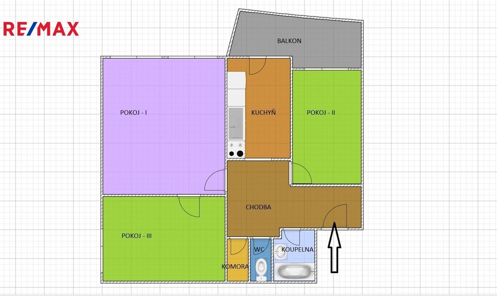 Prodej bytu 3 + 1 s velkým balkonem, na ploše 78 m2, umístěný v II.NP. Rozložení místností je vidět na přiloženém půdorysu. V případě koupě bytu jako investice pro následný pronájem, lze snadným způsobem v bytě vymezit čtyři samostatné pokoje se společným sociálním zázemím a kuchyní s balkonem (ideálně pro studenty).