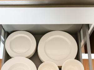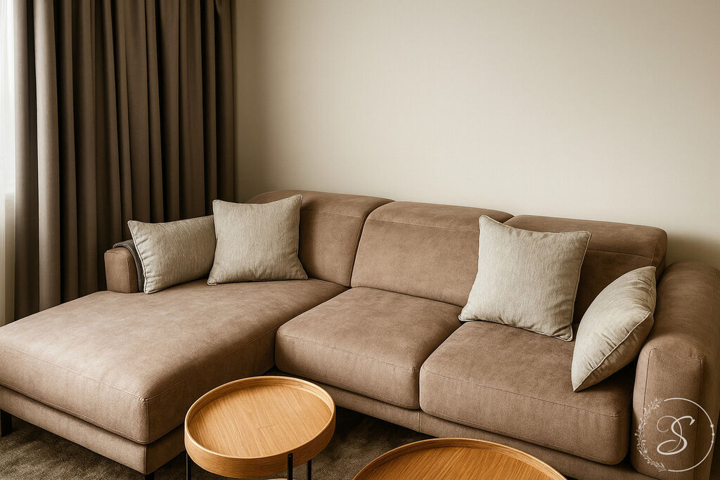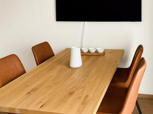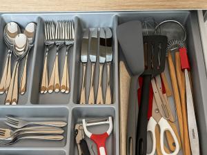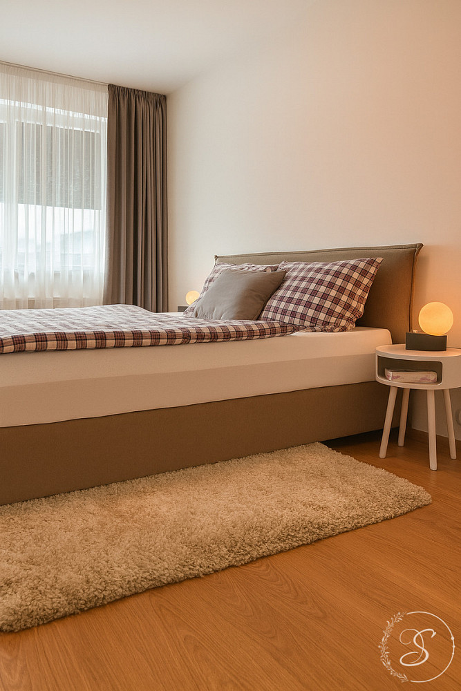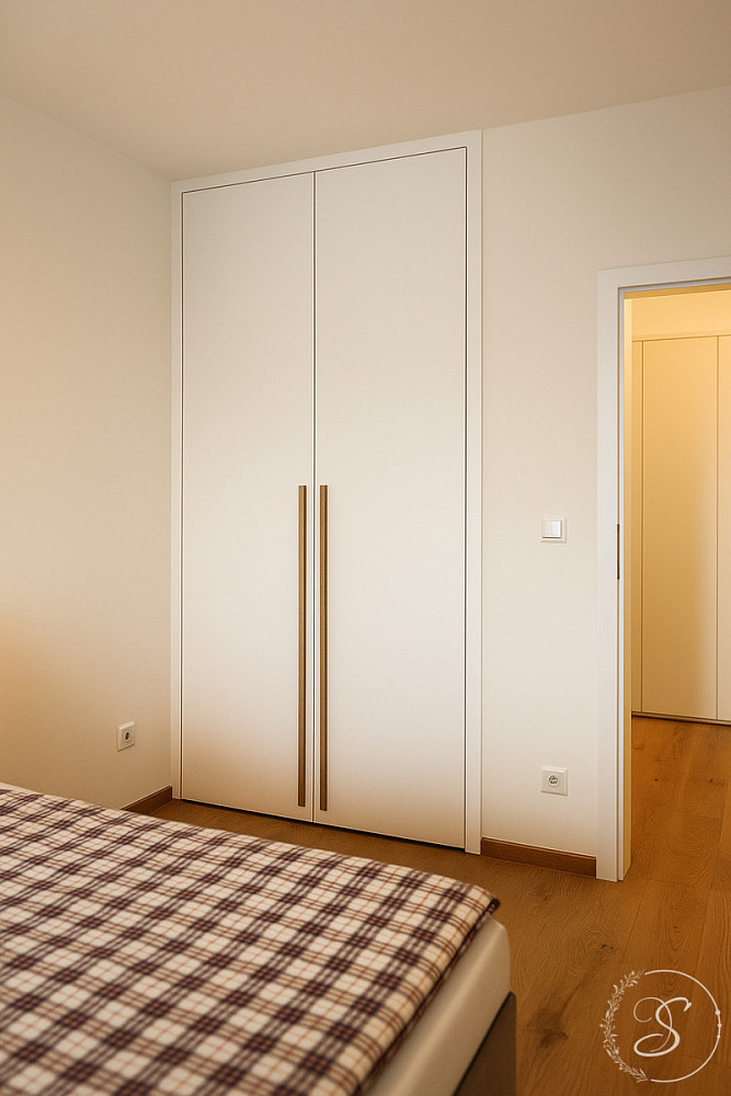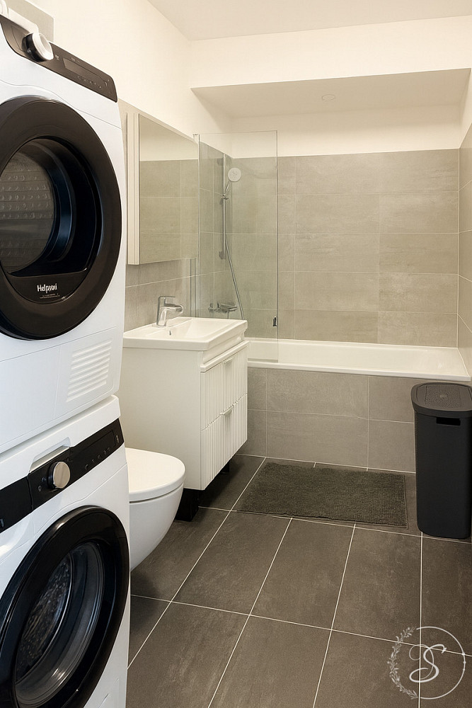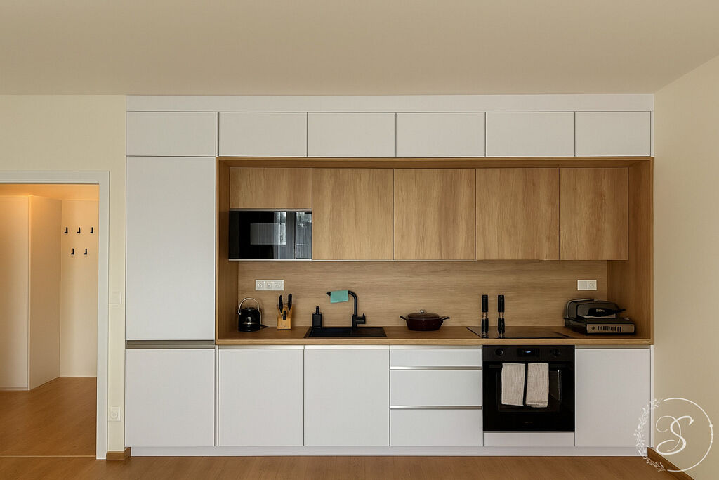 Interiér bytu byl navržen s důrazem na kvalitu, komfort a nadčasový design. Prostorný obývací pokoj s luxusní kuchyňskou linkou je vybaven špičkovými spotřebiči (lednice, trouba, varná deska, kávovar, konvice, kompletní sada nádobí). Dále se zde nachází útulná ložnice s šatnou, elegantní koupelna se sprchovou vanou, toaletou, pračkou a sušičkou, vstupní chodba a technická místnost. Byt působí vzdušně a svěže díky velkoformátovým oknům, elektrickým venkovním žaluziím a designovým zatemňovacím závěsům.